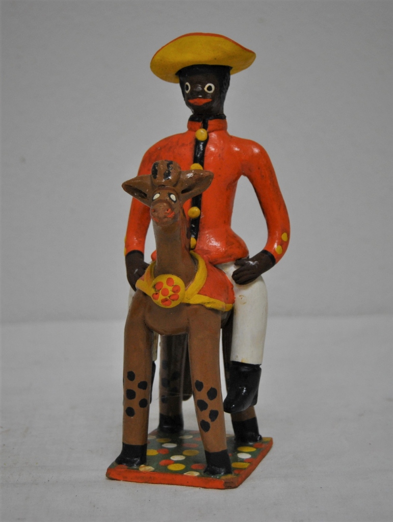 Par de figuras em cerâmica popular portuguesa, representando 2 cavaleiros. Artesanato de Estremoz, com decoração policroma pintada à mão. Século XX. Desgastes e pequeno defeito (1 orelha do cavalo está partida).