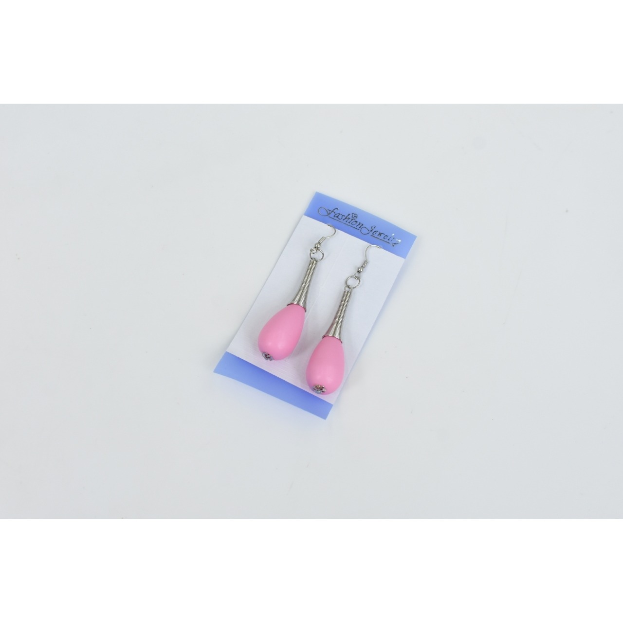 Par de brincos em metal prateado com conta cor de rosa em plástico em forma de gota