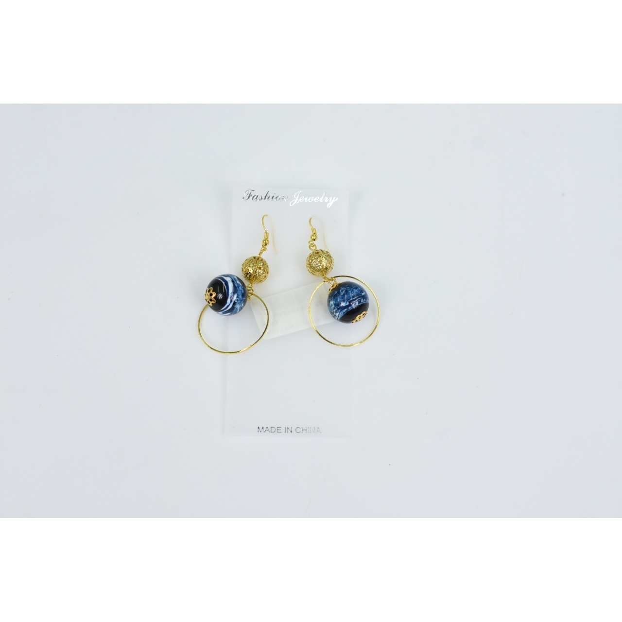 Par de brincos em metal dourado com conta em plástico em tons de azul