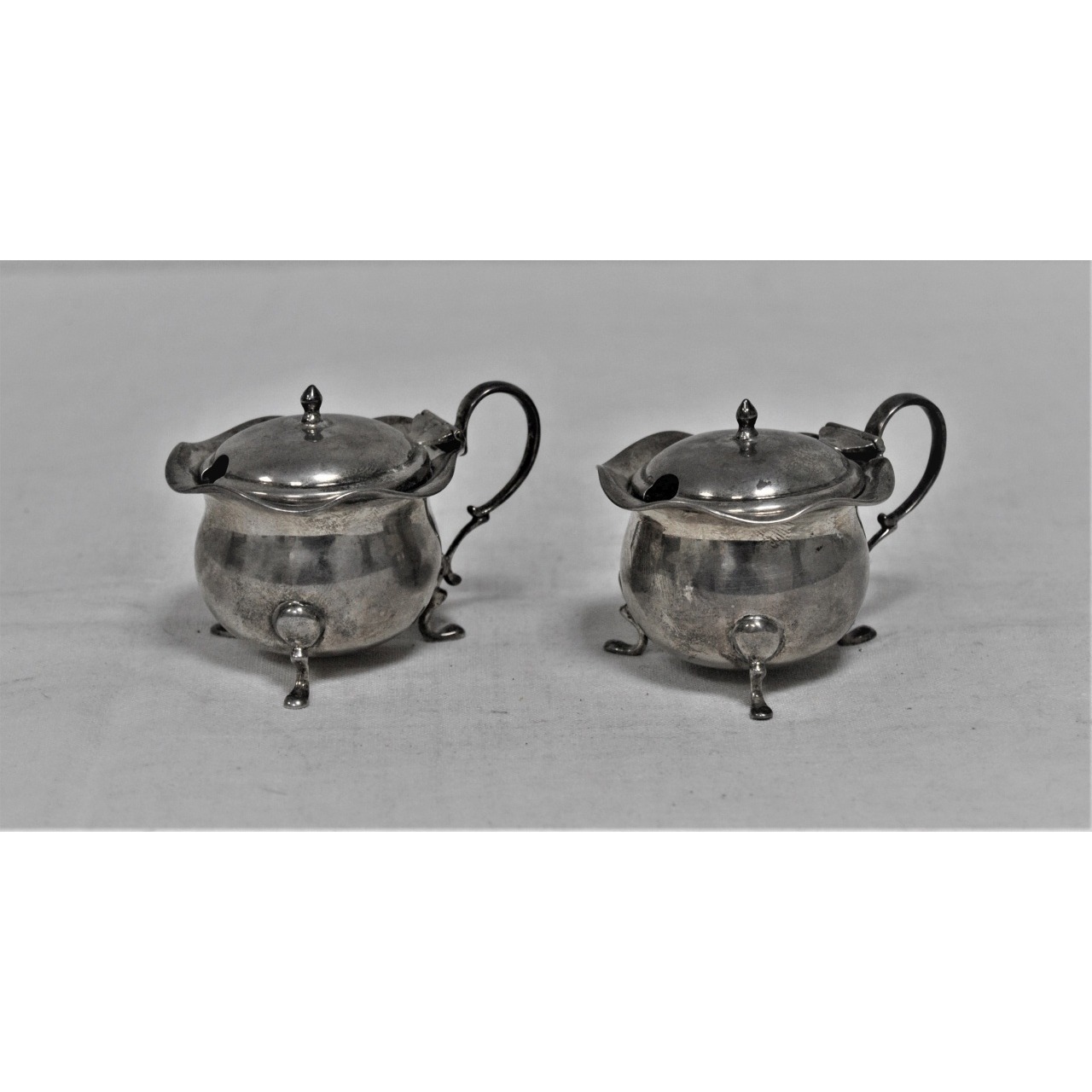 Saleiro e Pimenteiro em prata inglesa, decorados com bordo ondulado e assentes em 3 pés. Com pequenos recipientes de vidro, em tons de azul, no seu interior.