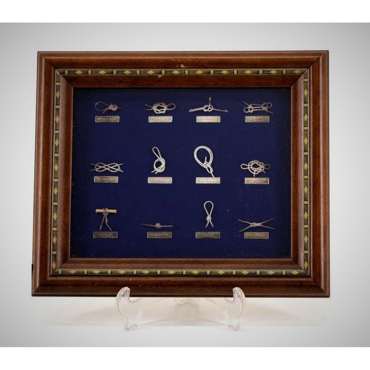 Quadro expositor decorado com nós de marinheiro em metal prateado, com moldura em madeira e vidro. Século XX.