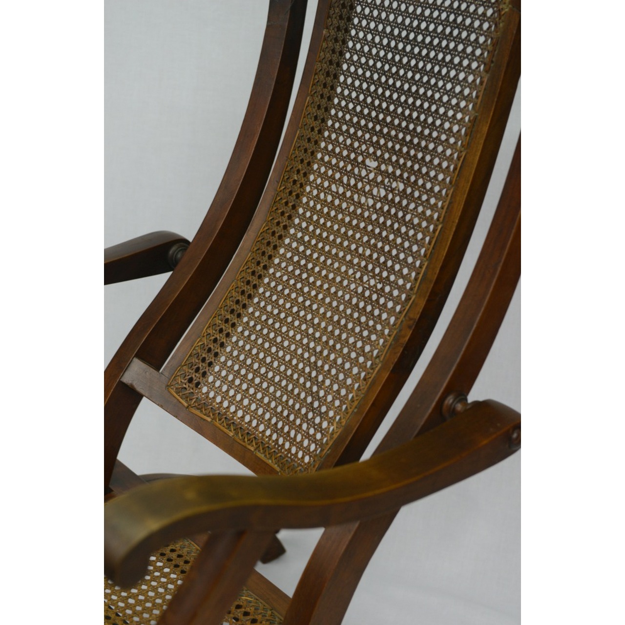 Cadeirão de braços articulado, em madeira, com costas e assento em palhinha. Modelo semelhante ao estilo indo-português