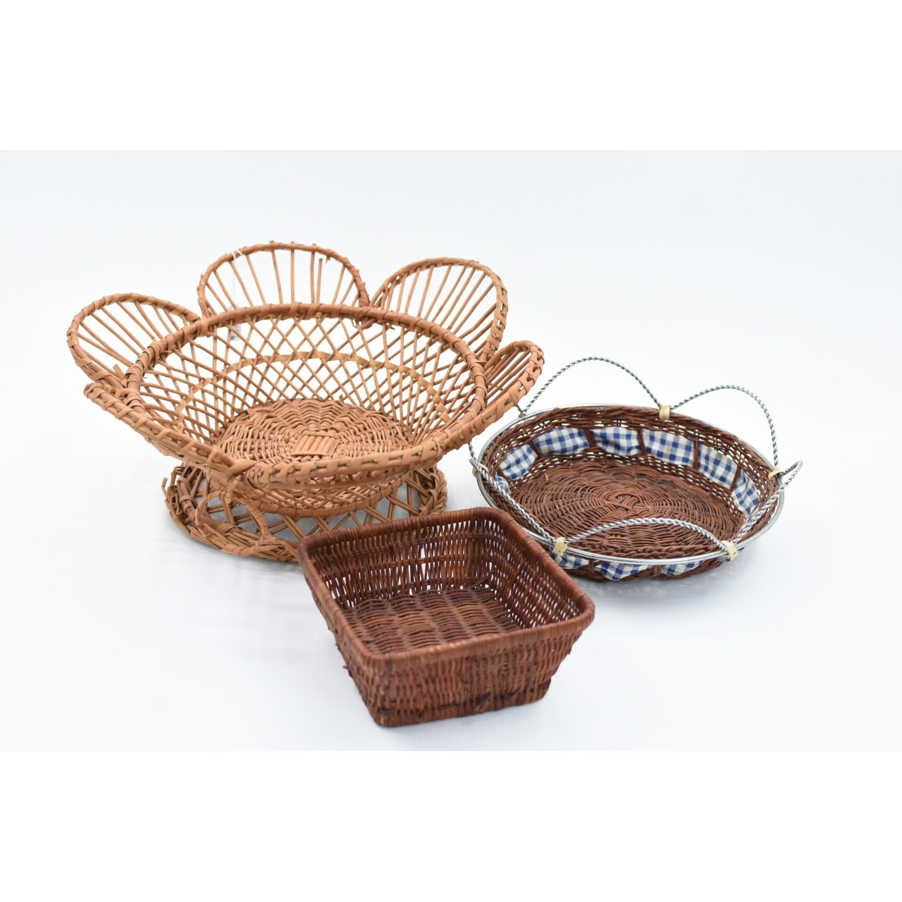Conjunto de 3 cestas em verga duas redondas uma delas com tecido, e outra quadrada