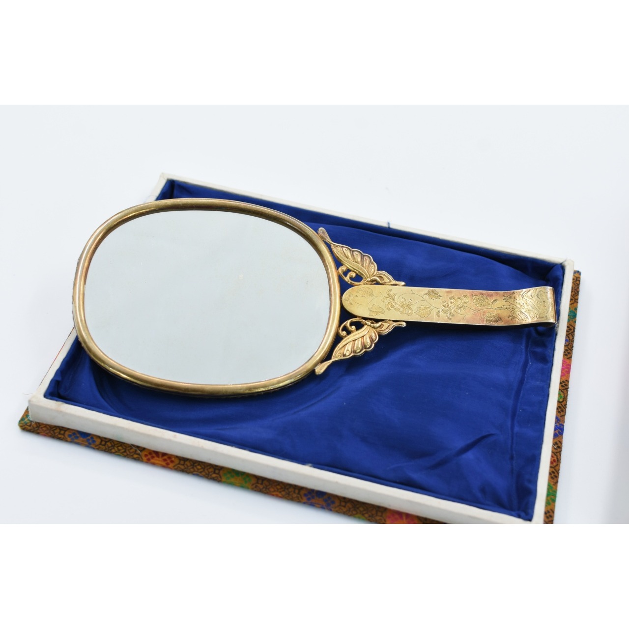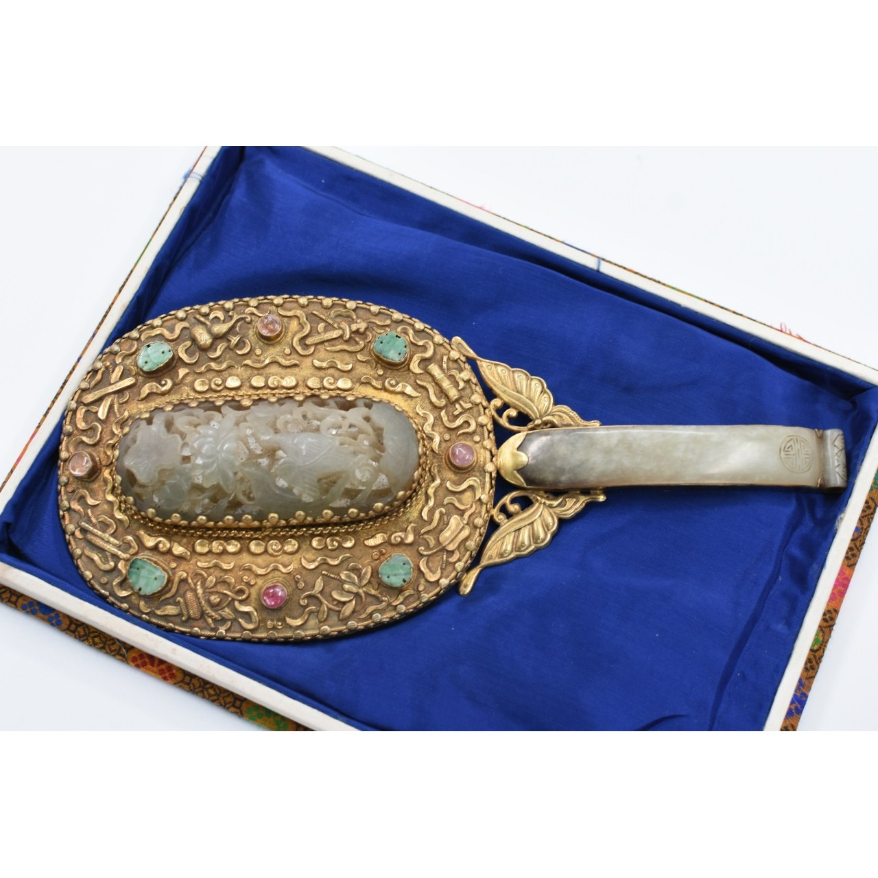 Espelho de mão em prata dourada com pedras incrustadas em estojo próprio