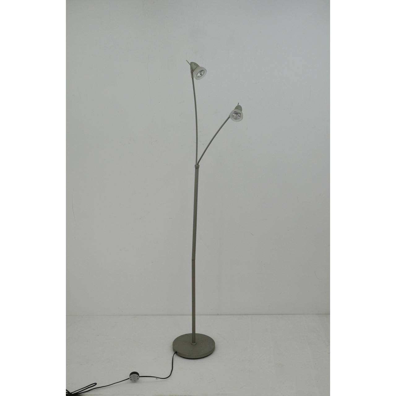 Candeeiro de pé com 2 holofotes em aço inox, com 2 braços e holofotes em vidro fosco. Electrificado e a funcionar. Século XX
