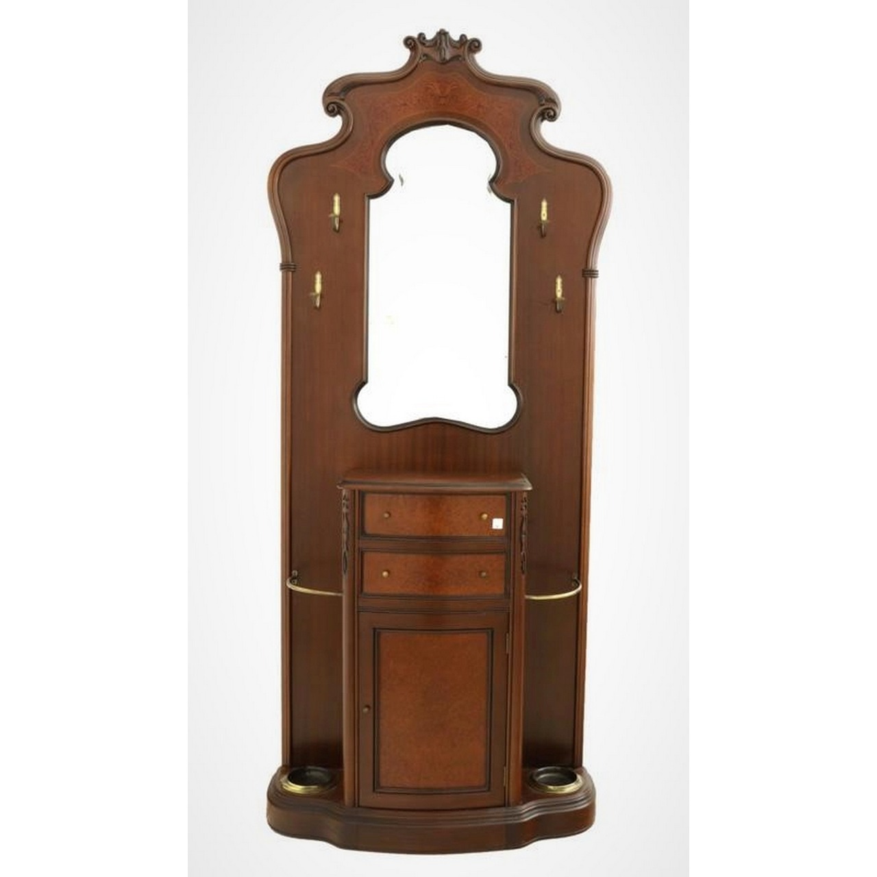 Móvel de entrada com alçado, espelho e bengaleiro, estilo Clássico, em madeira. Espelho com vidro biselado. Corpo do móvel com 2 gavetas e 1 porta, 2 bengaleiros laterais e cabides. Montagens em metal dourado. Século XX.