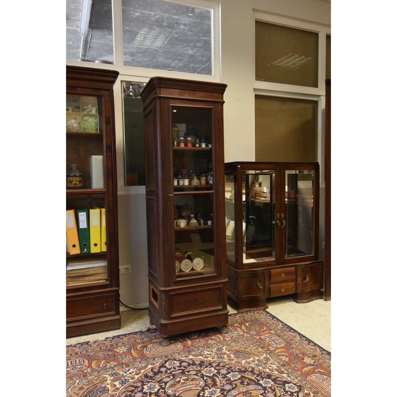 Móvel vitrine com porta em vidro e gaveta na parte inferior. Interior compartimentado por 4 prateleiras
