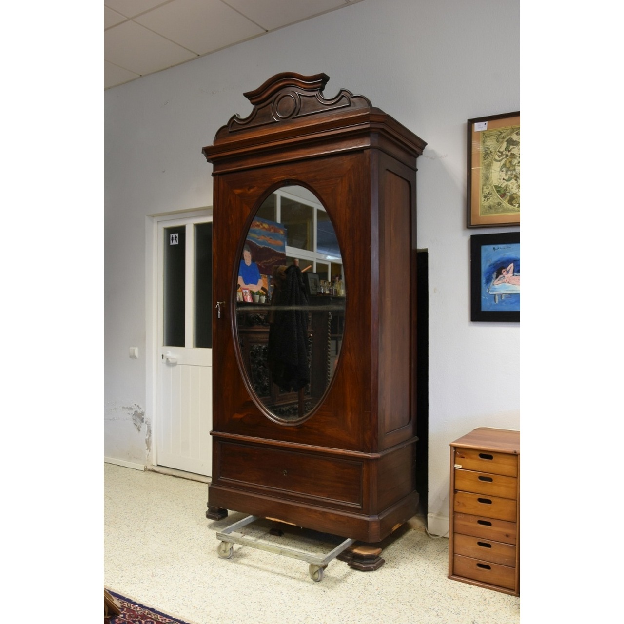 Armário roupeiro estilo romântico em madeira com porta com espelho, e parte inferior com gaveta