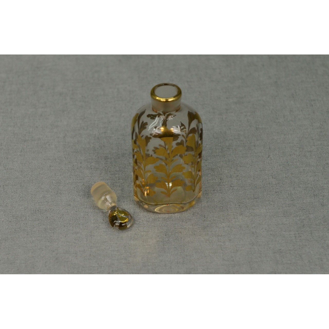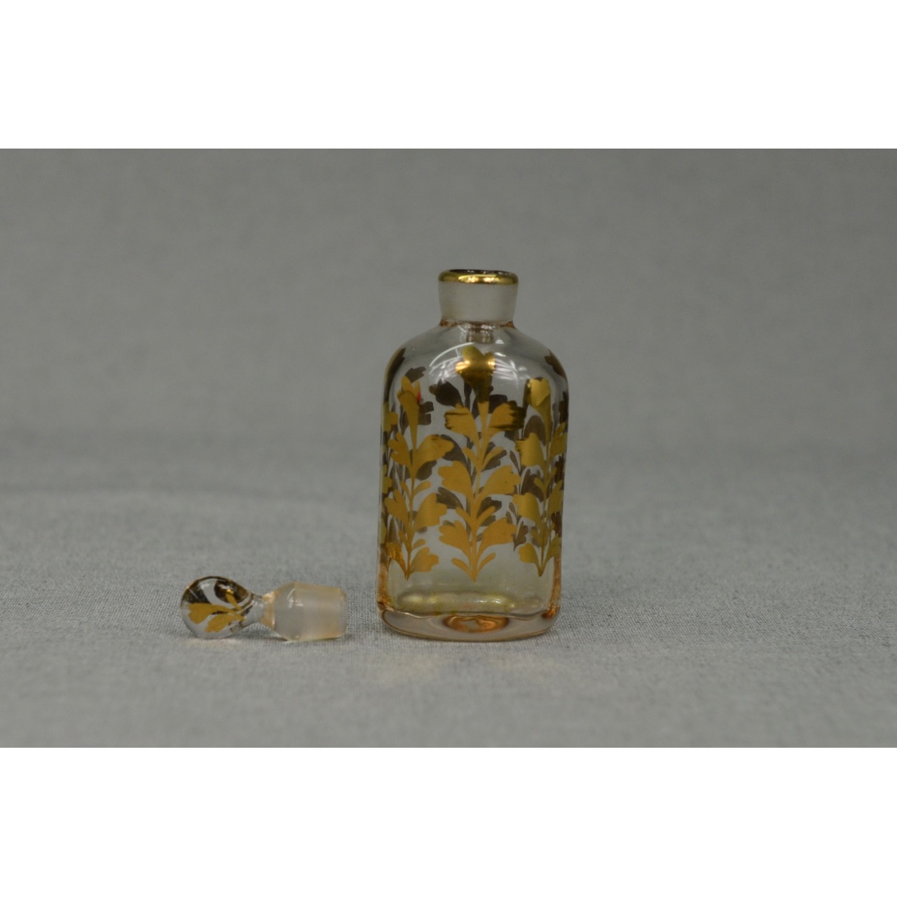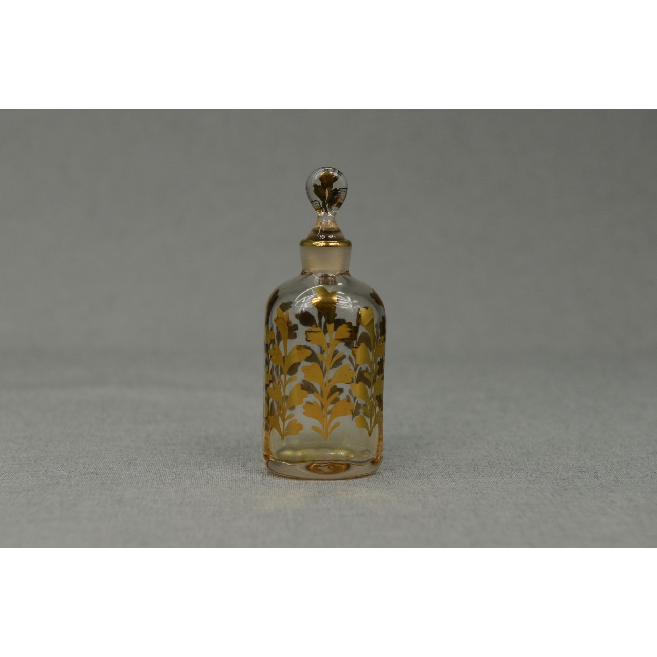 Frasco de perfume em vidro antigo, com decoração vegetalista pintada à mão em tons de dourado. Possivelmente século XIX