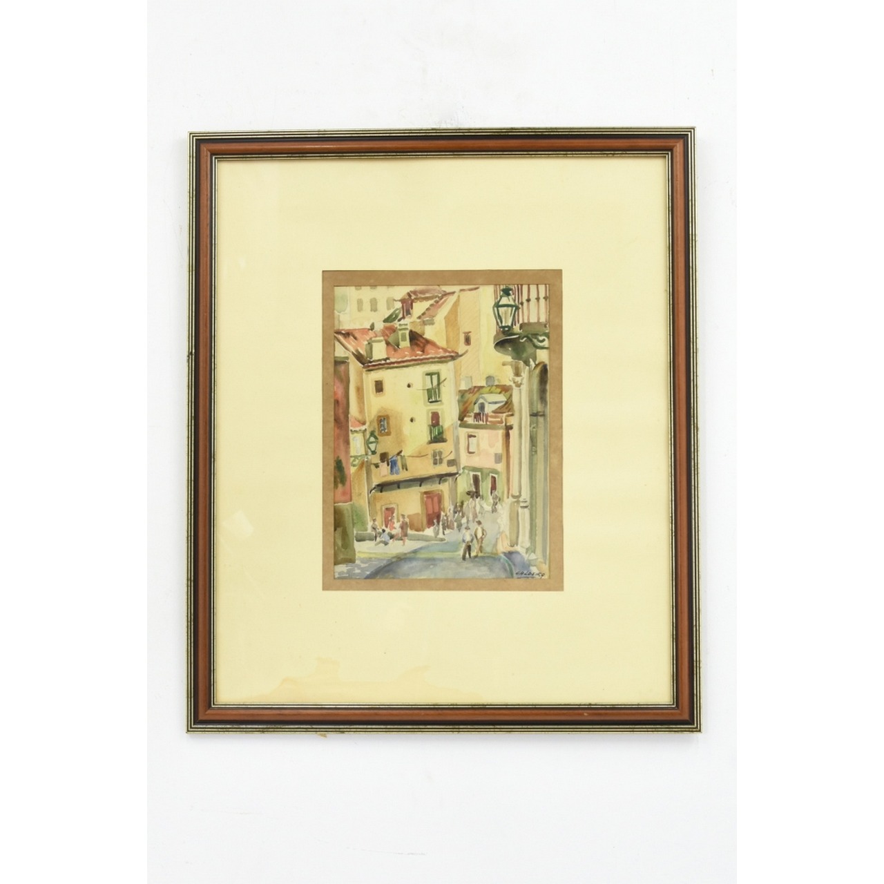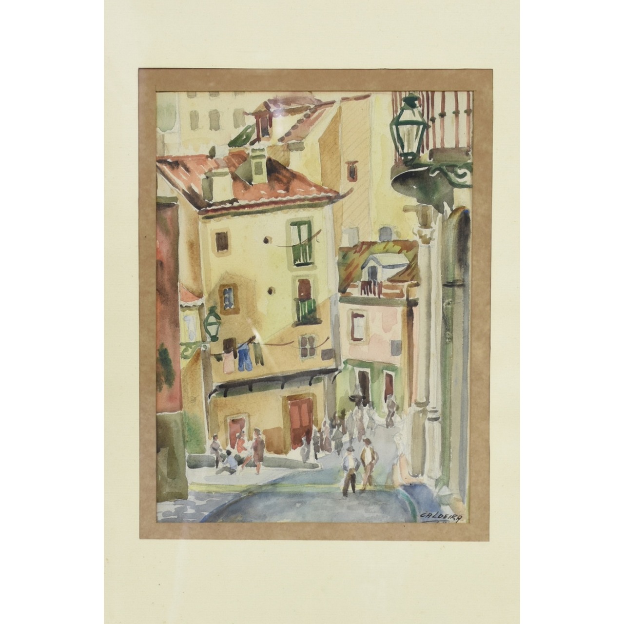 Aguarela sobre Papel com tema "Casario-ruela com figuras"", Assinado Caldeira. Com moldura