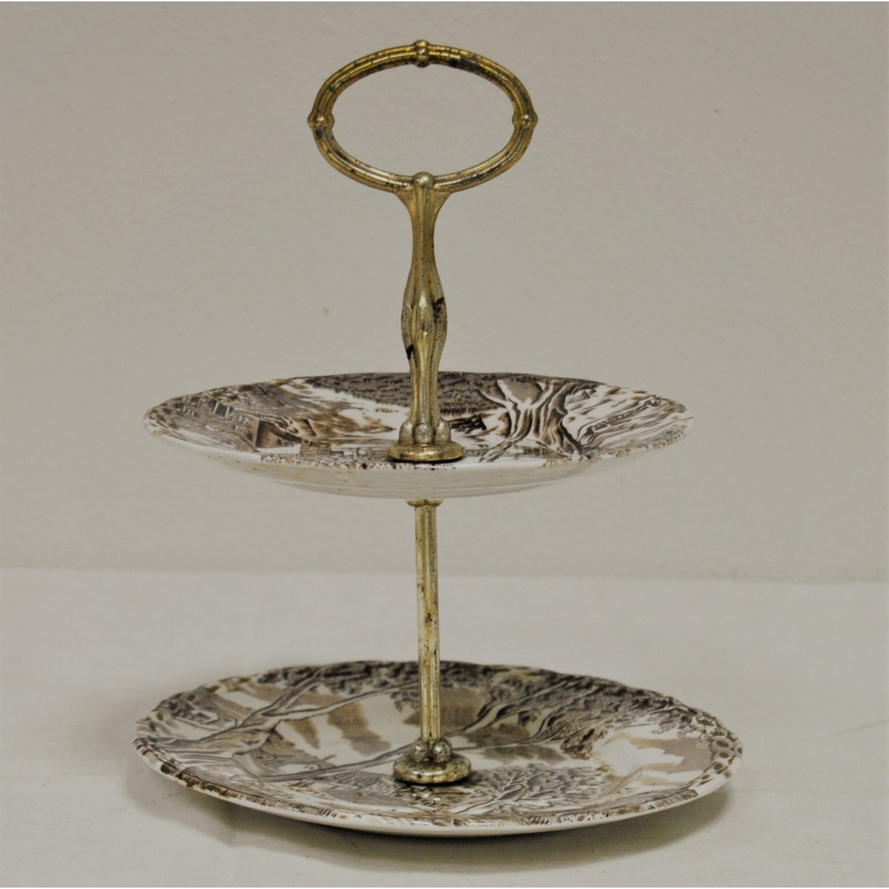 Boleira em faiança inglesa, composta por 2 pratos circulares com decoração floral e paisagens em tons de castanho sobre fundo branco, apoiados em base de metal prateado. Marcados Staffordshire, coleção Sunday Morning.