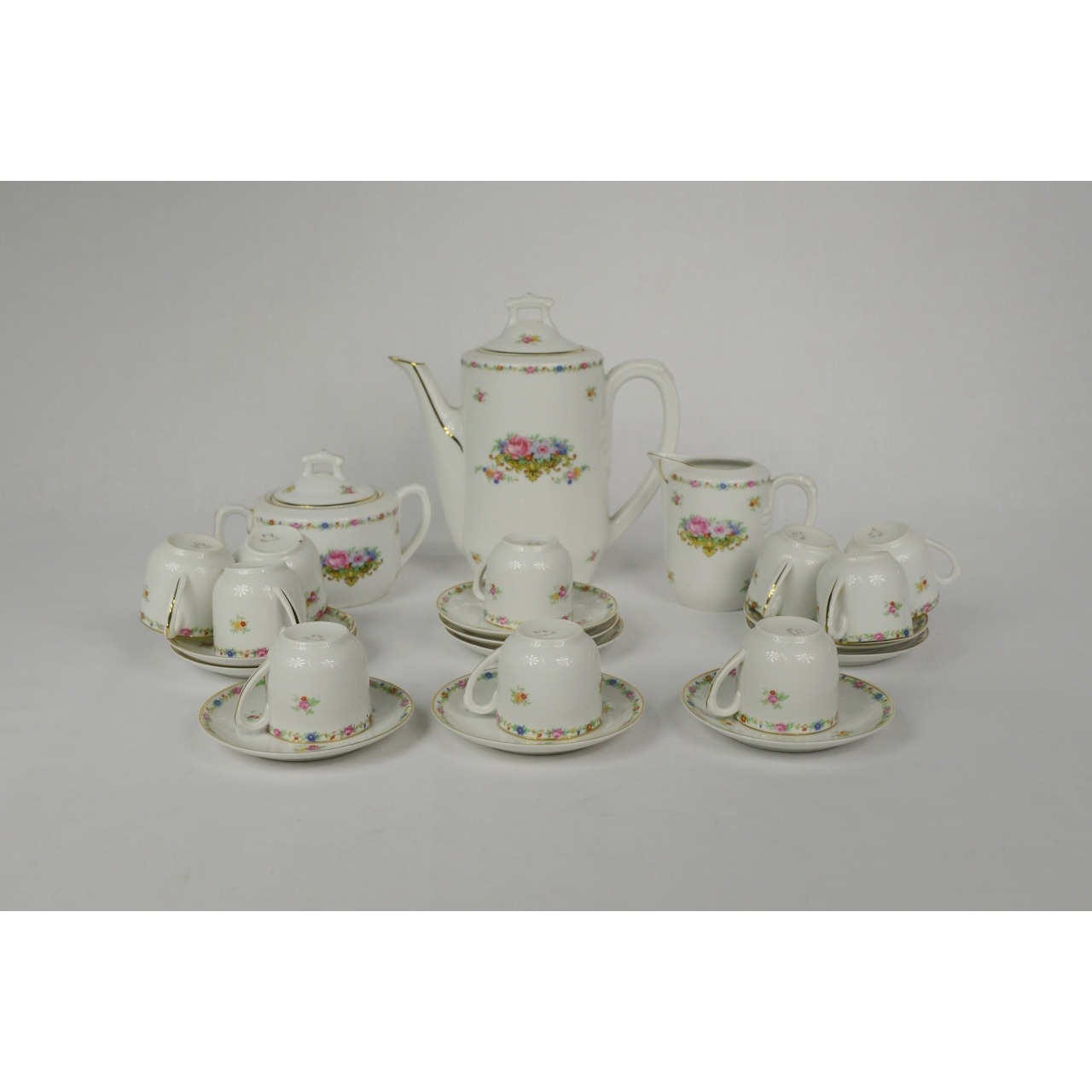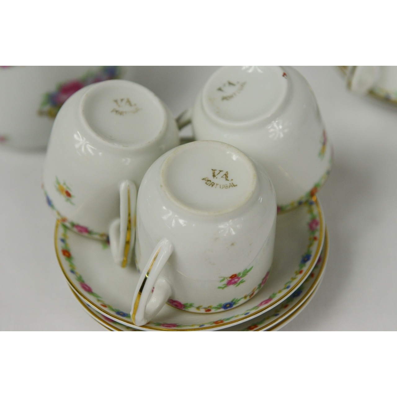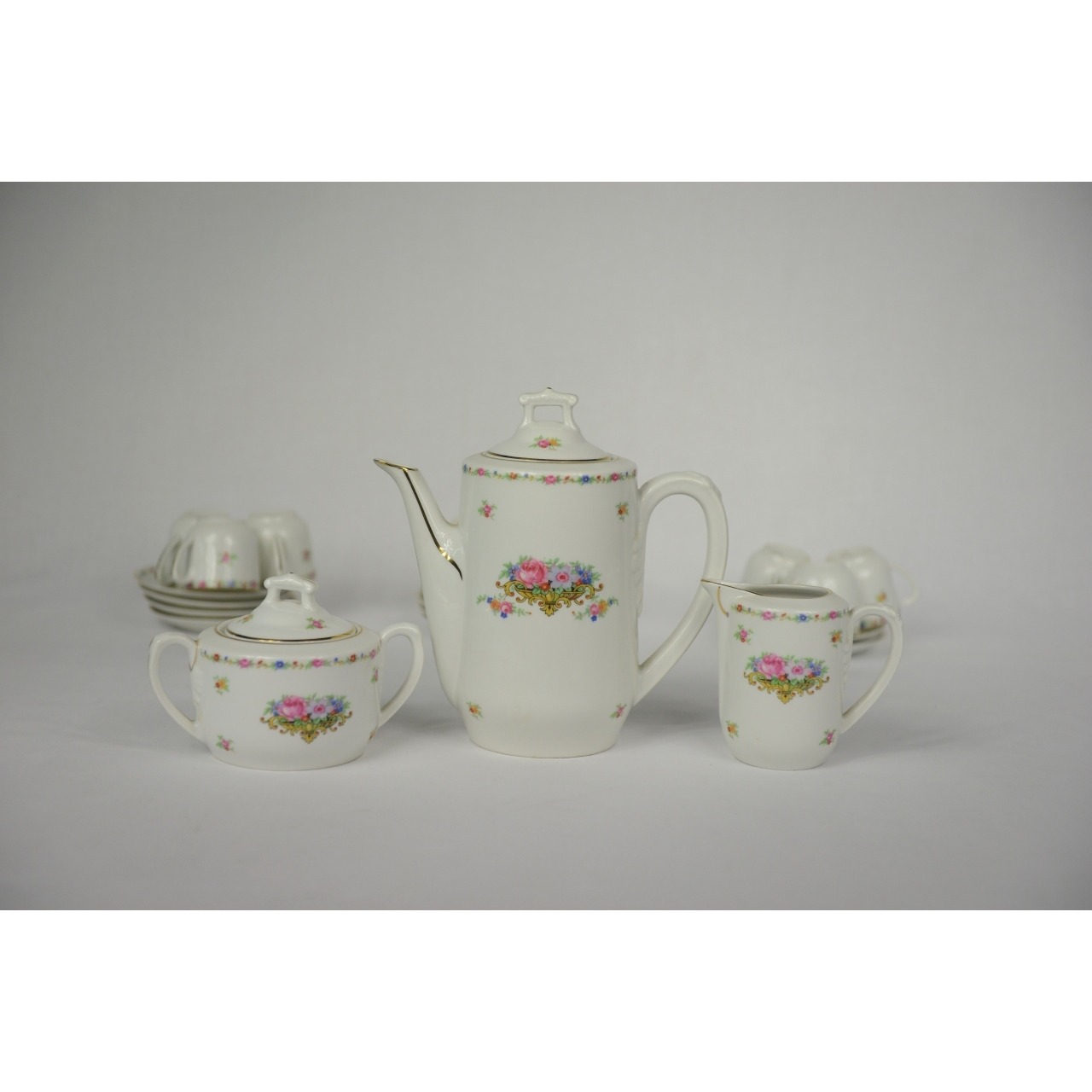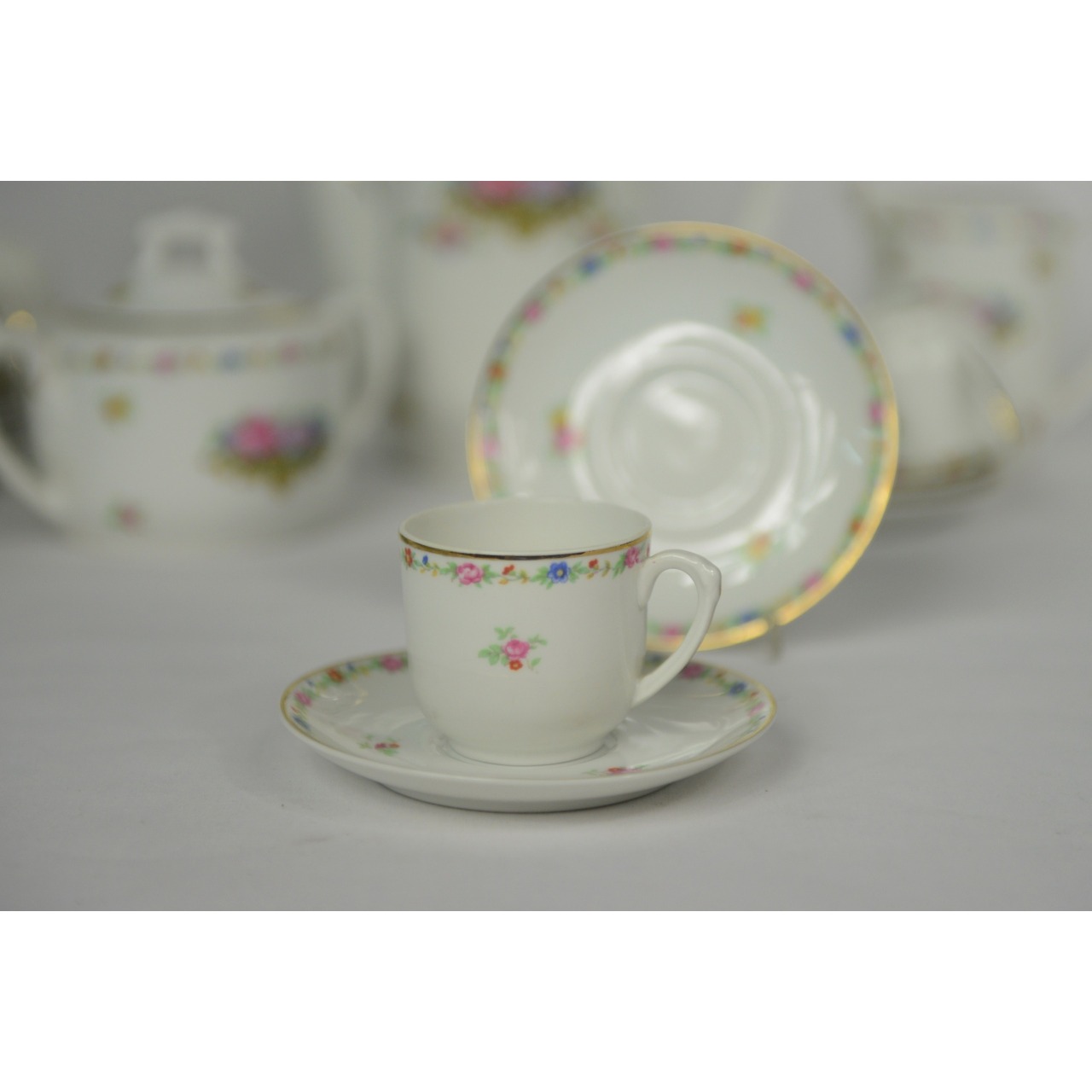 Serviço de café em porcelana da Vista Alegre, c marca n.º 29, usada entre 1922-1947. Composto por cafeteira, açucareiro, leiteira, pequena taça e conjunto de 10 chávenas e pires