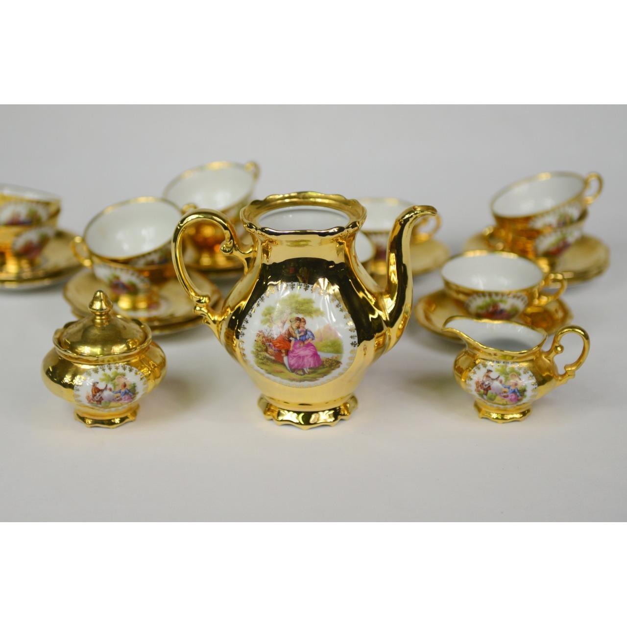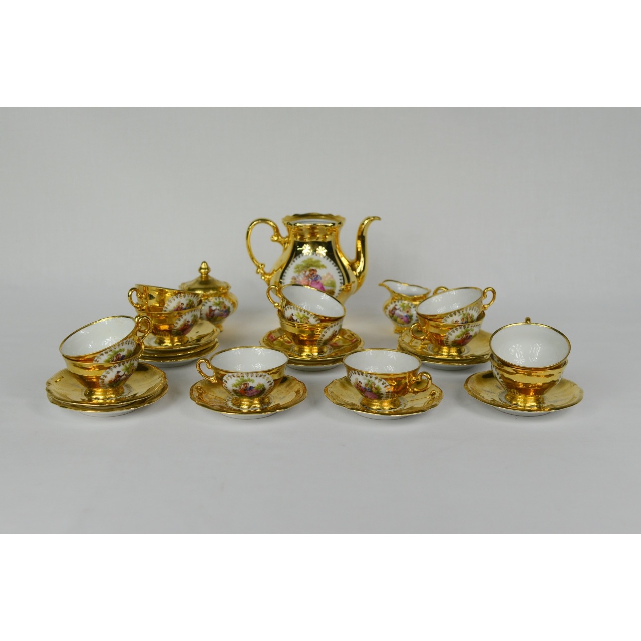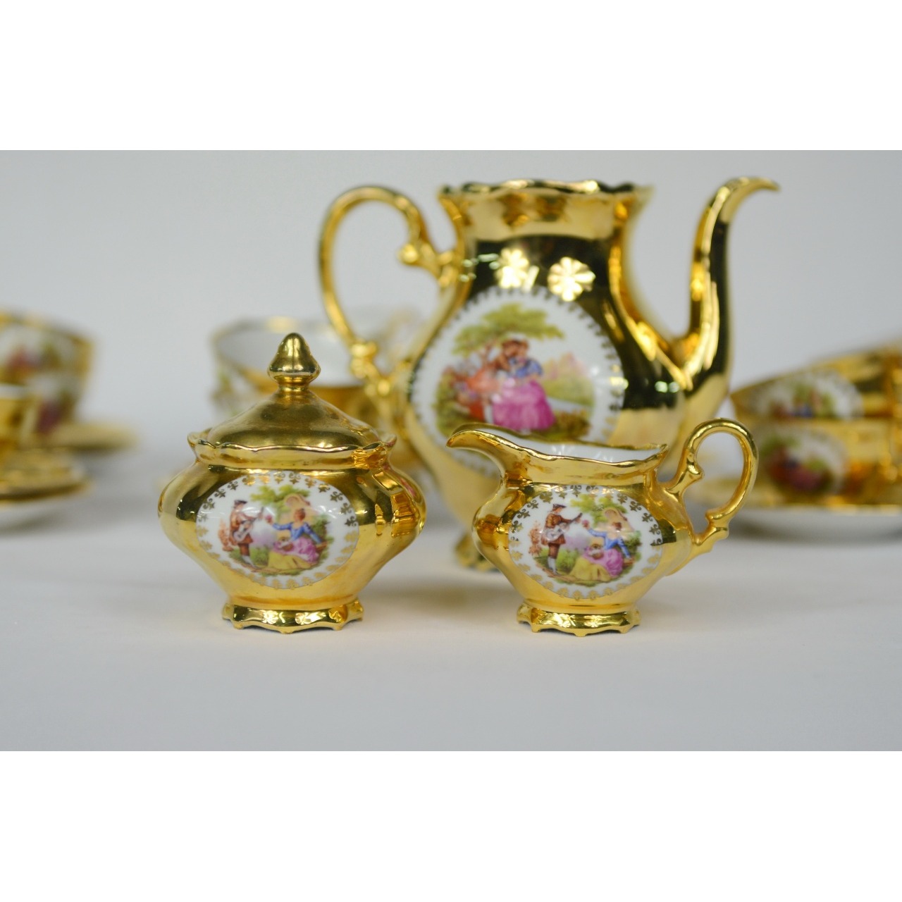 Serviço de chá em porcelana alemã Marcado “Bavaria, Waldershof, Germany”. Composto por bule, açucareiro, leiteira, 12 chávenas de café e 12 respetivos pires. Falta a tampa do bule.