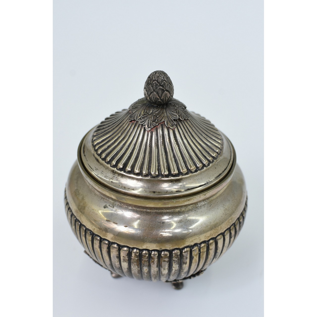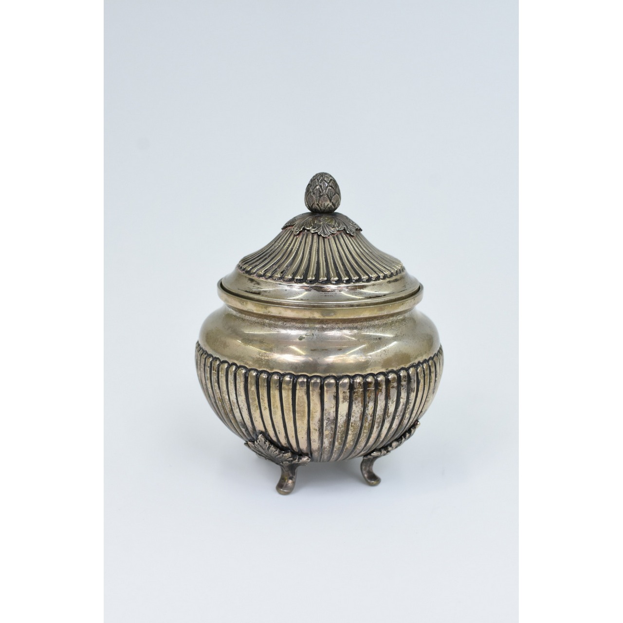 Açucareiro em prata M.G Águia com o toque de 0,833, ornamentado por friso de caneluras relevadas. Peso: 462gr