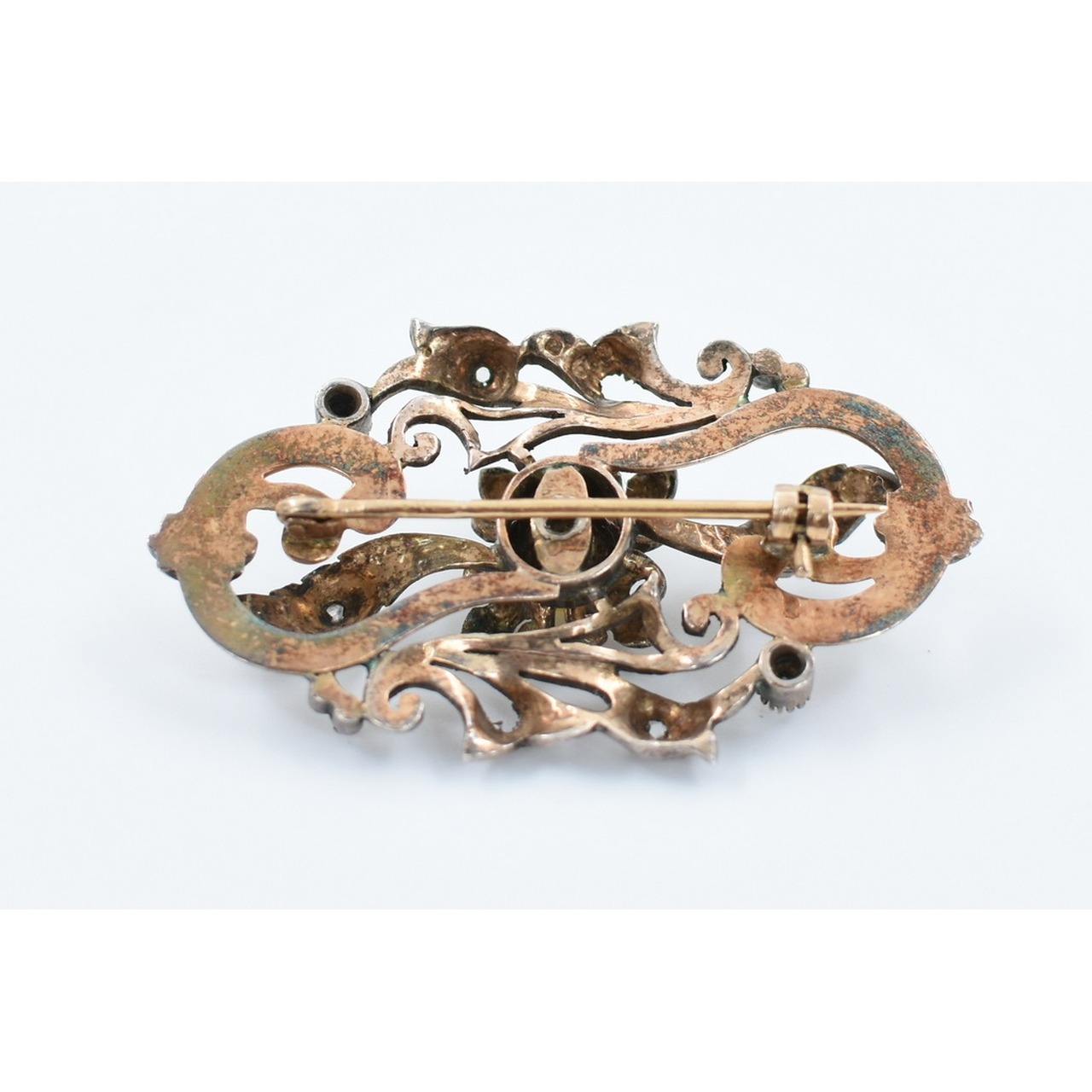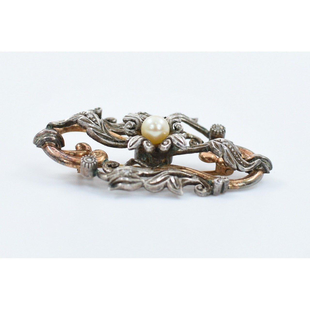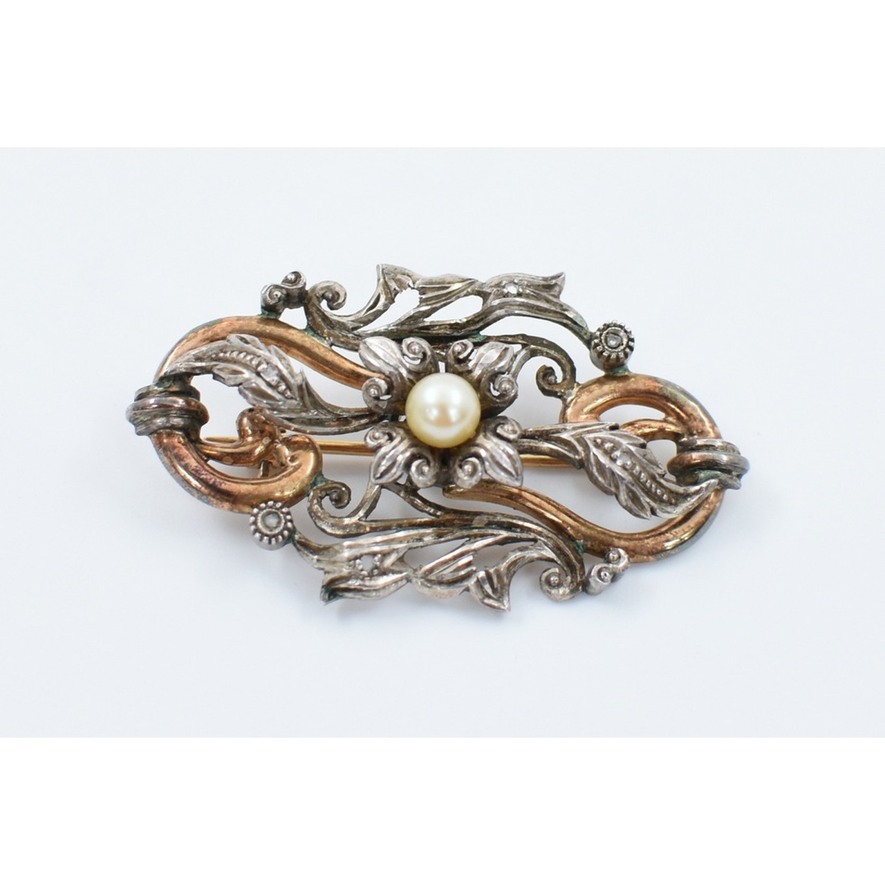 Alfinete de peito em ouro e prata, decoração vegetalista c/ pérola ao centro