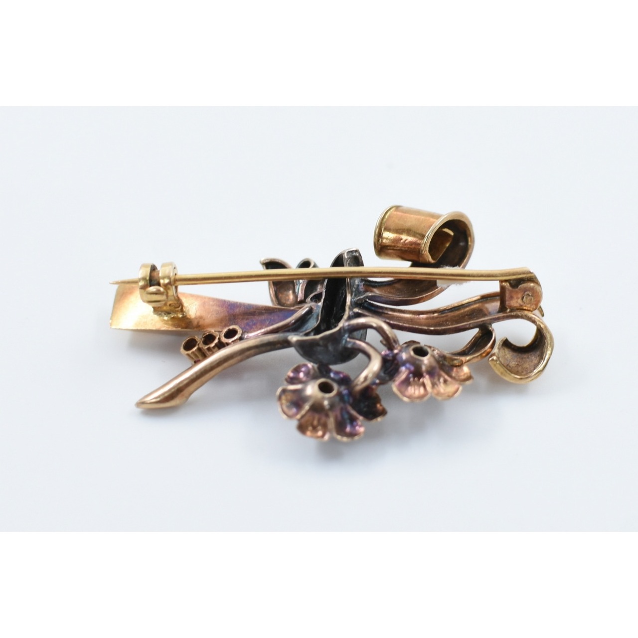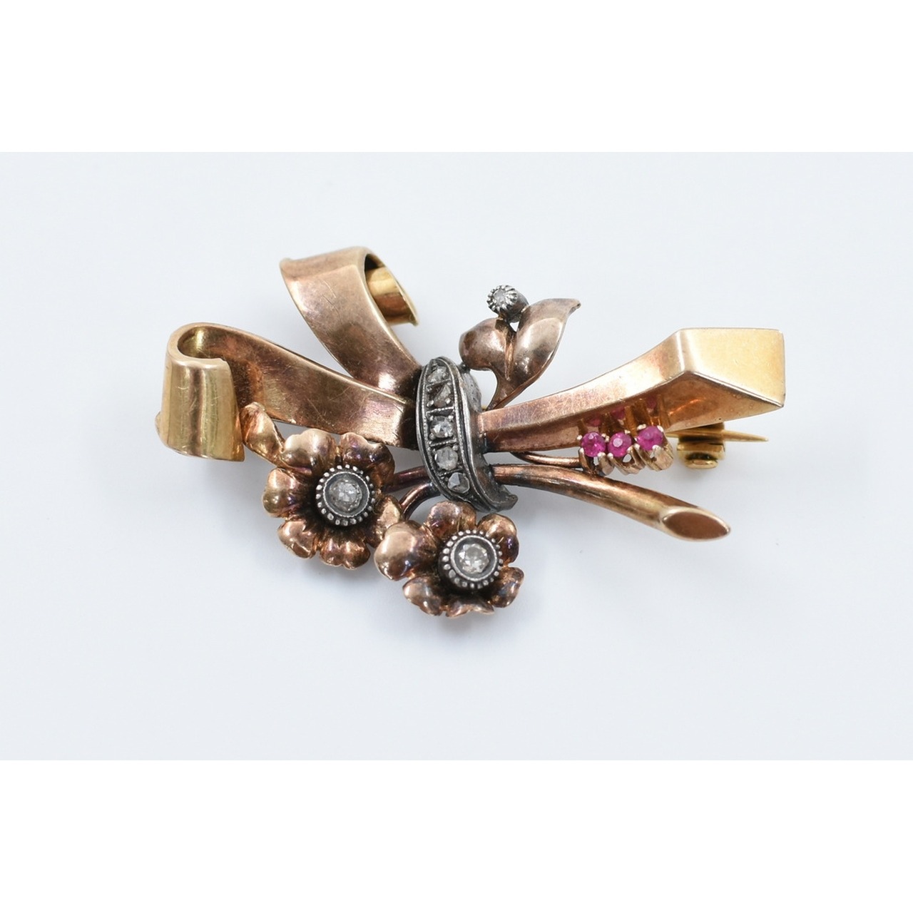Alfinete de peito em ouro e prata, em forma de bouquet, c/ brilhantes incrustados, estilo Art Deco
