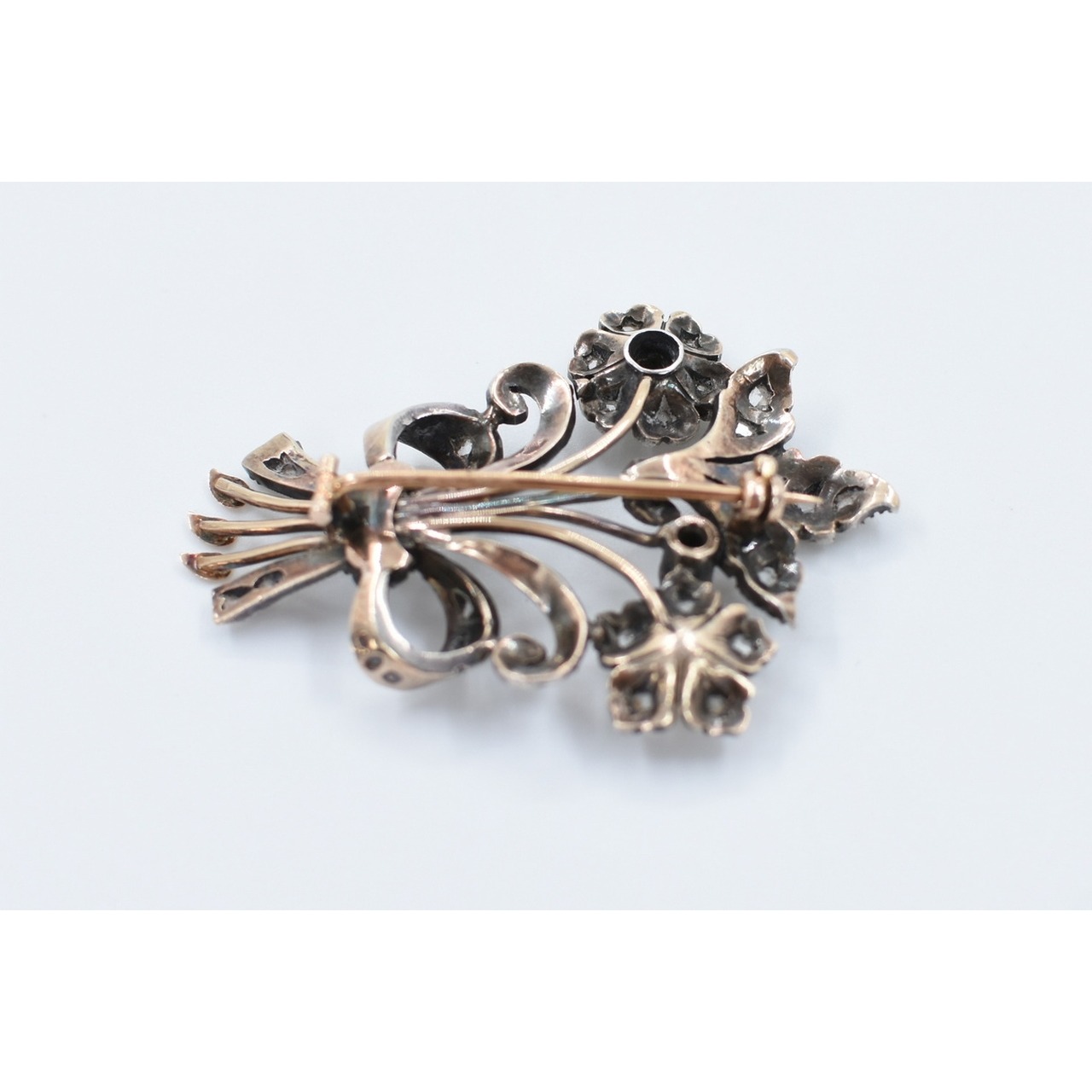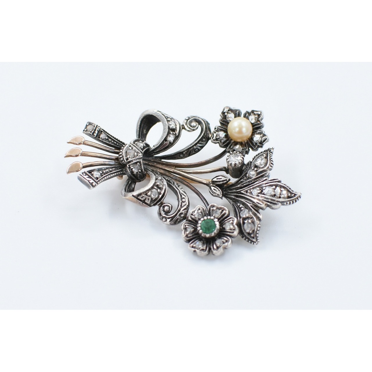 Alfinete de peito em ouro e prata, estilo Art Deco, c/ brilhantes, pérola e esmeralda