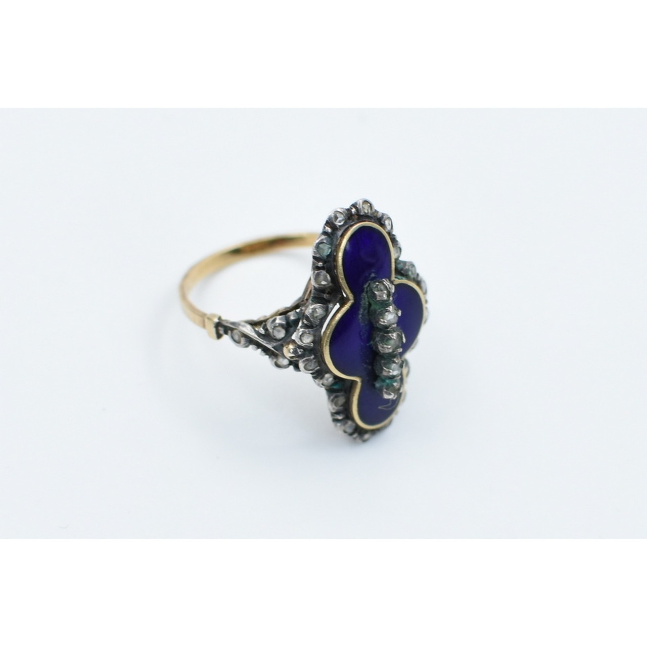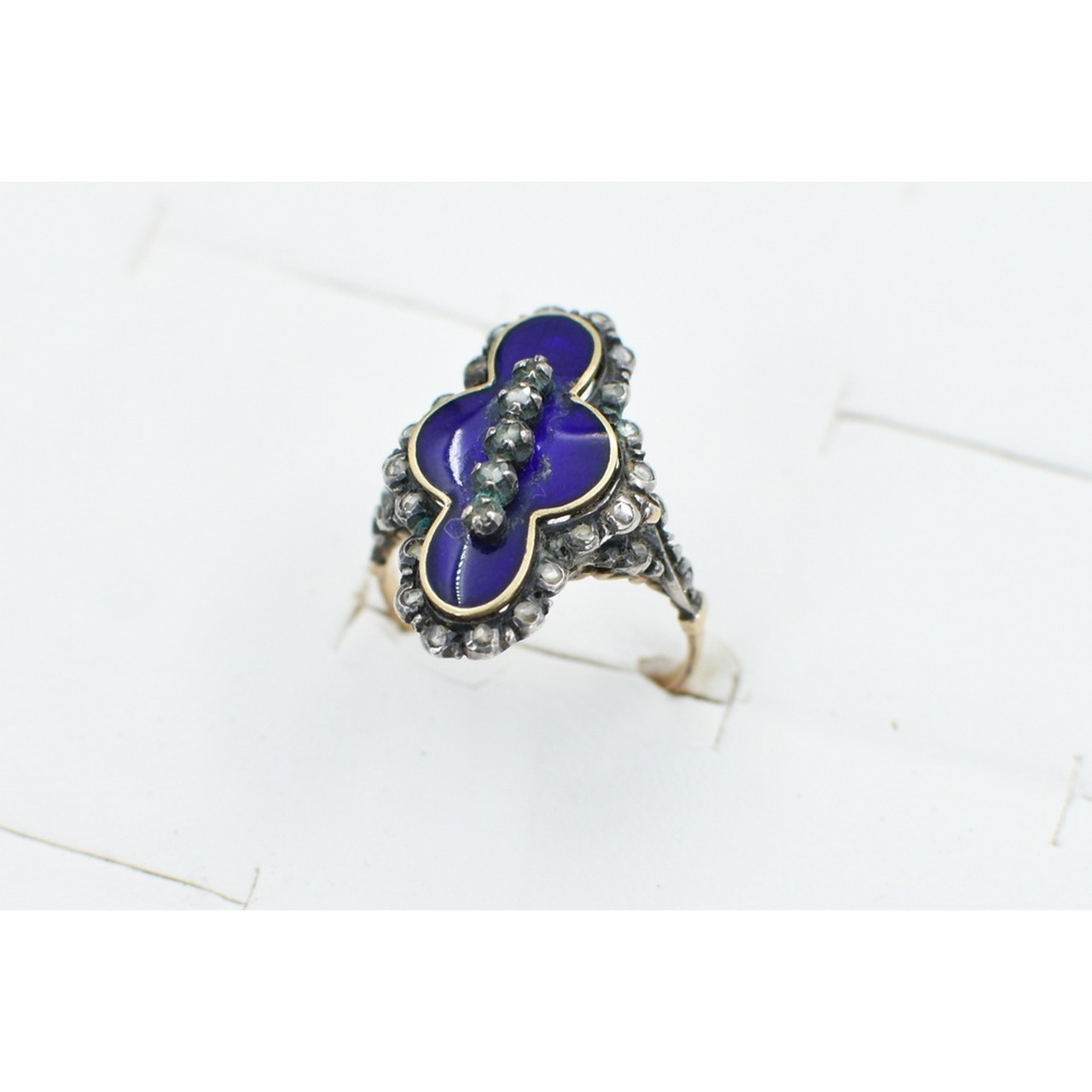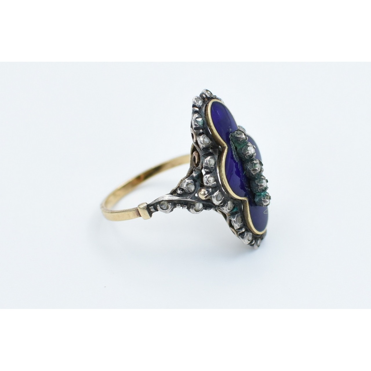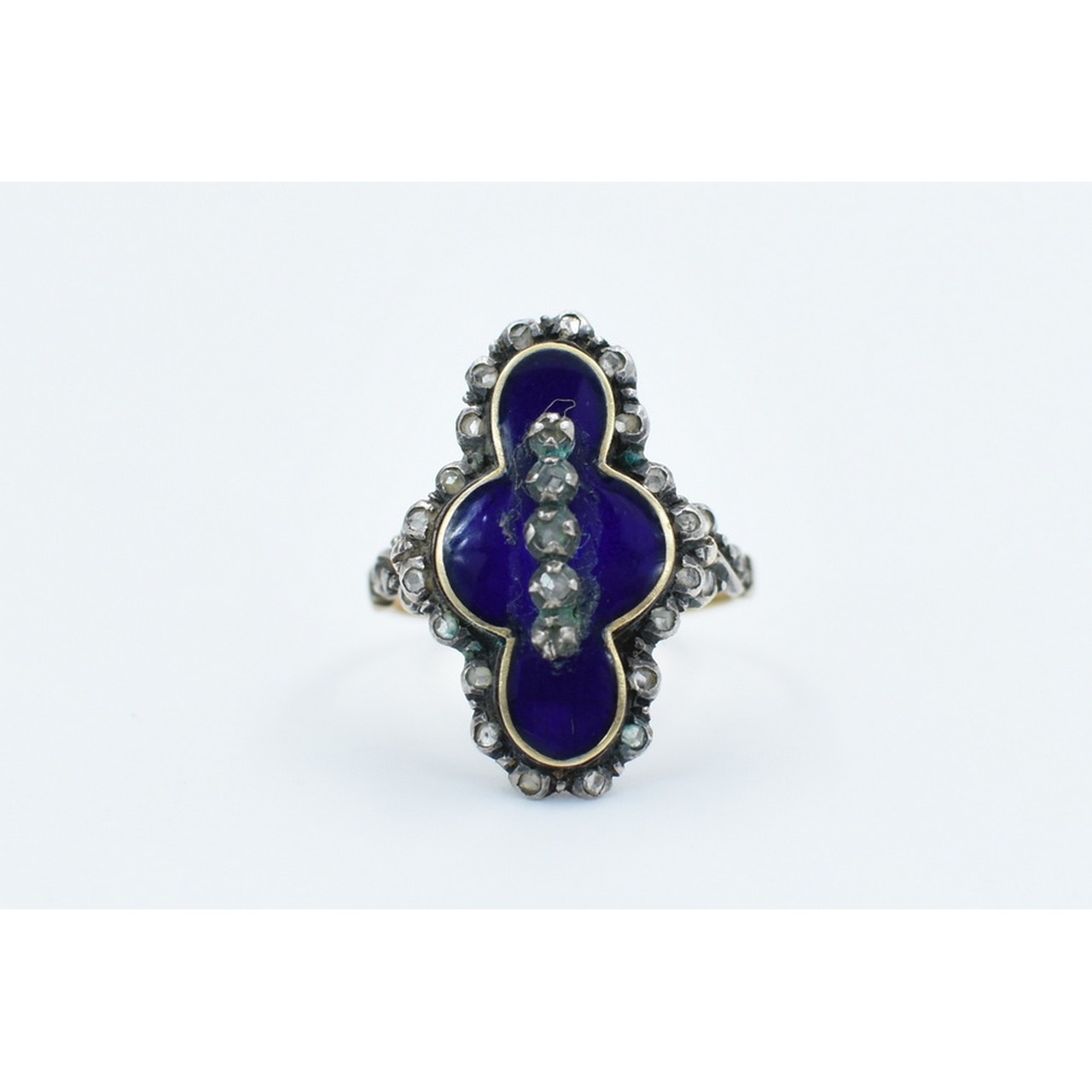 Anel em ouro e prata, M.G., cravejado com 25 diamantes e esmalte azul. Peso: 4,8gr
