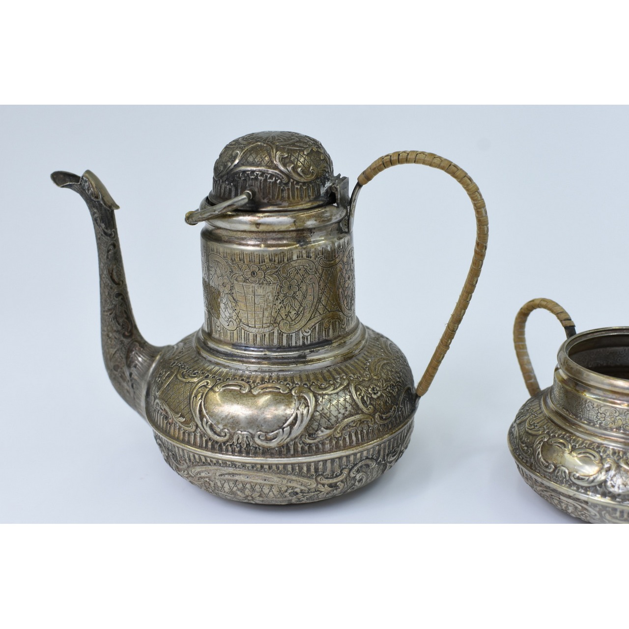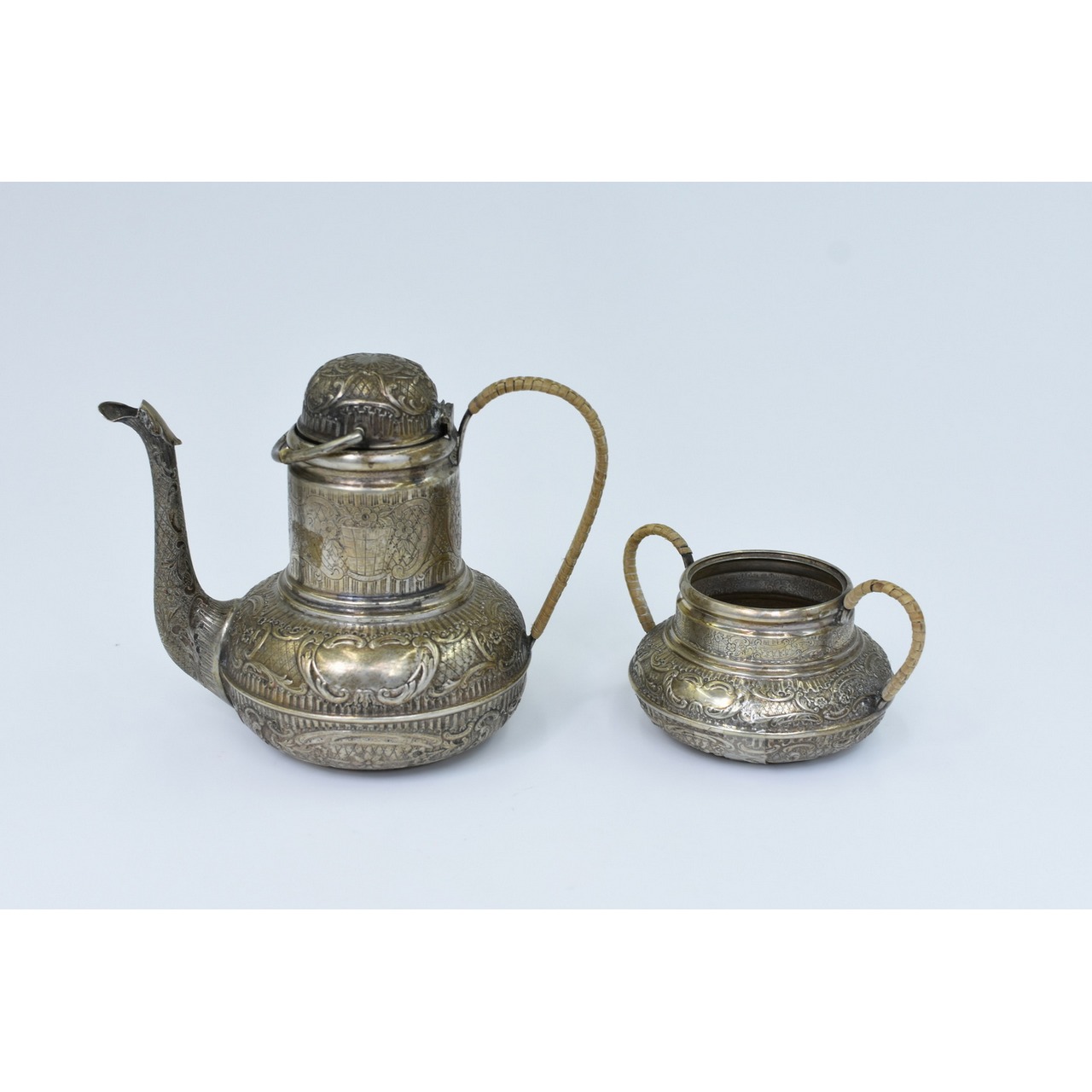 Bule e açucareiro em prata M.G Javali II com asas encanastradas. Ambas as peças totalmente lavradas e ambas com reserva de nome. Peso: 564gr