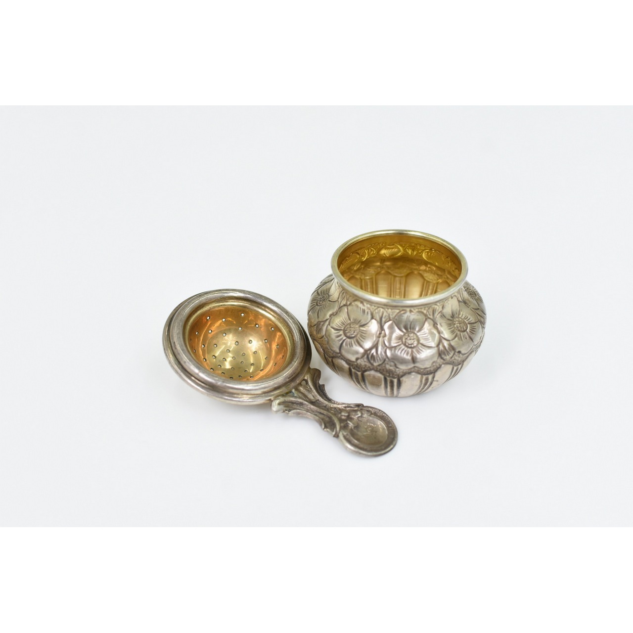 Coador para chá com respectivo recipiente, prata M.G com o toque de 0,925 decorado com motivos florais. Peso: 69gr