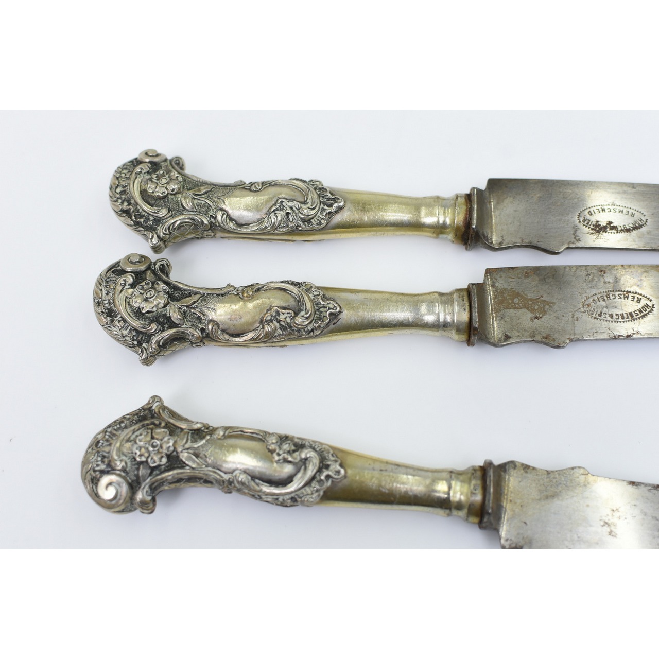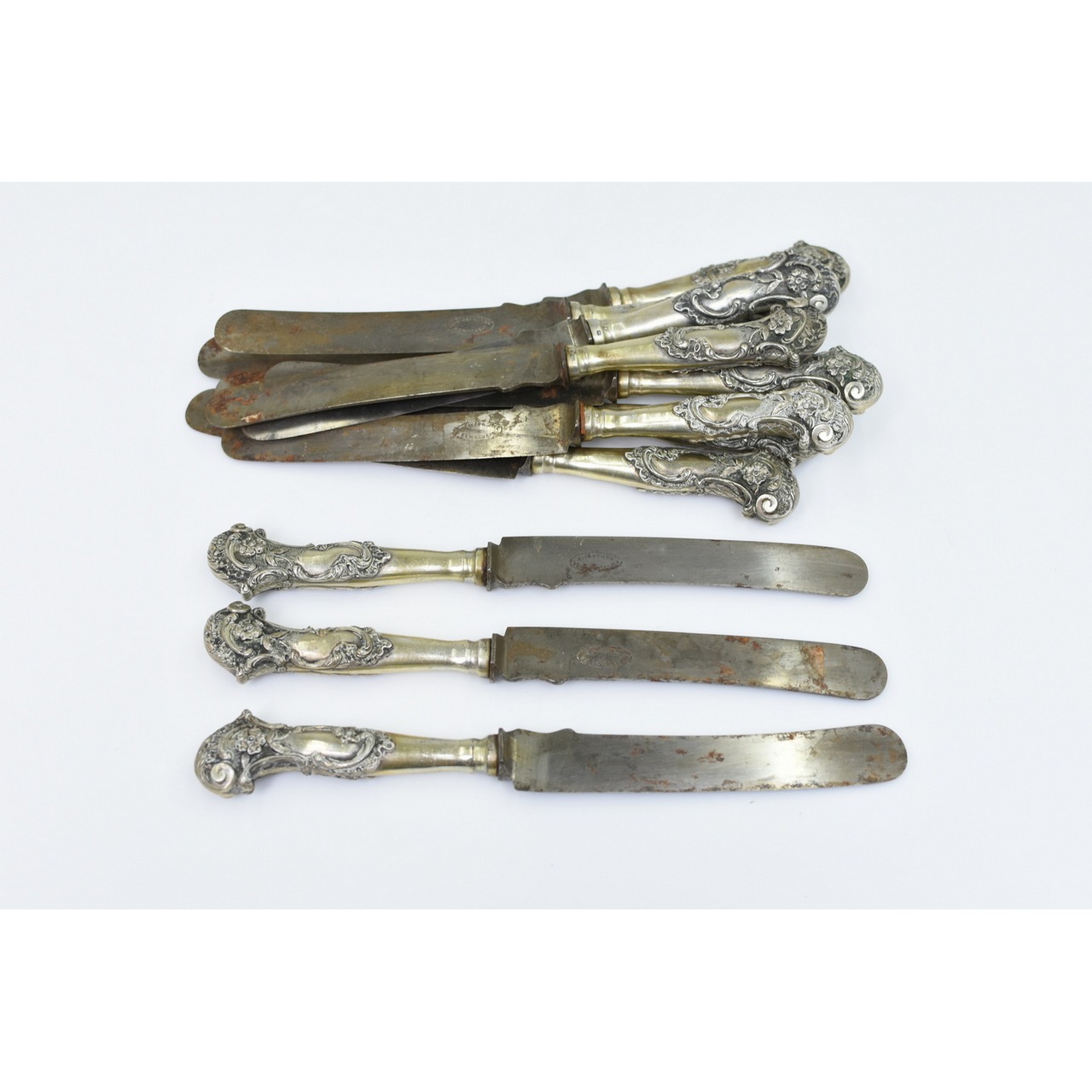12 facas de mesa com cabos em prata M.G. Javali II (Modelo cabos pistola) P:B.: 1.608gr