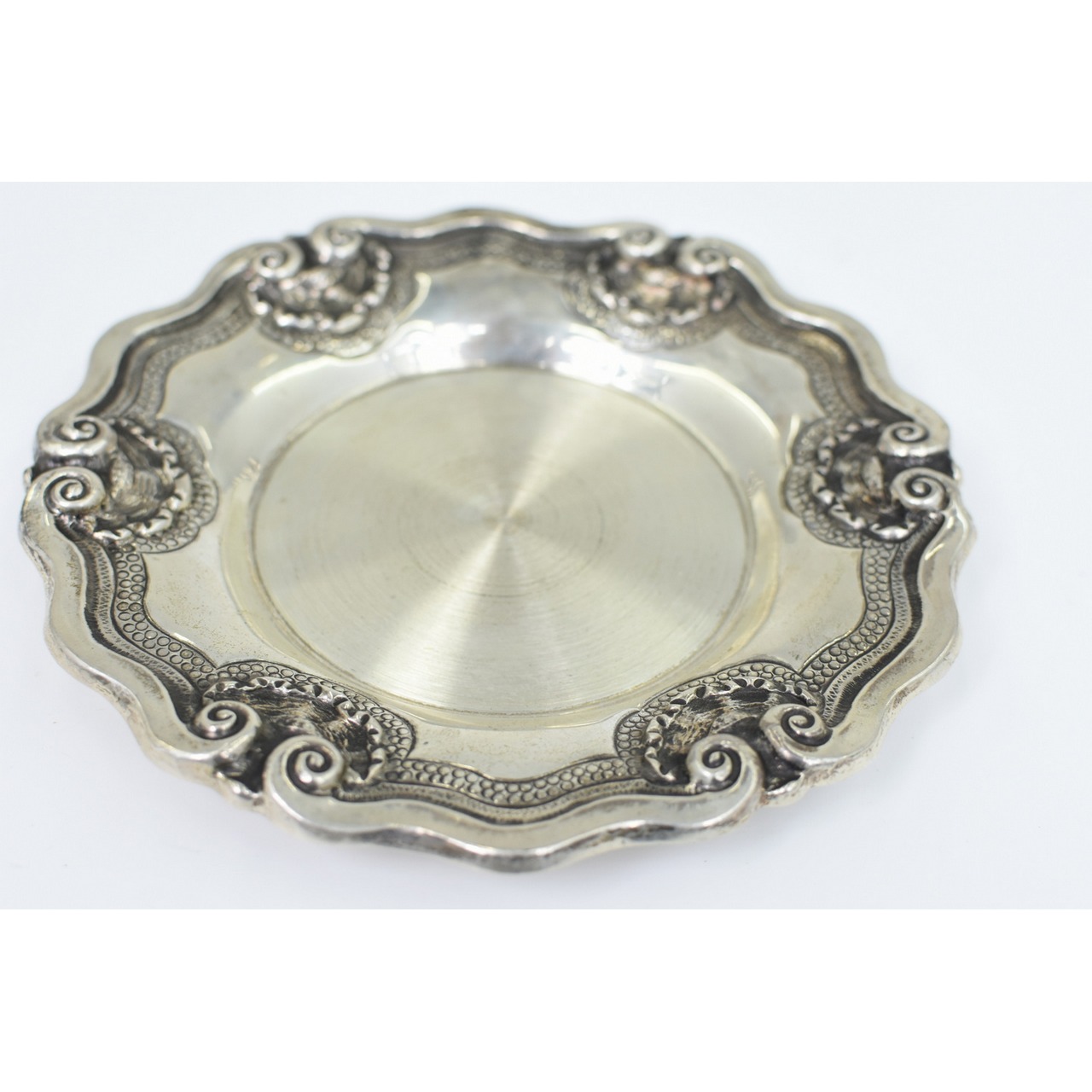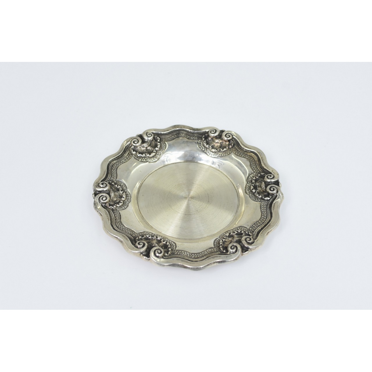 Salva em prata M.G Aguia com o toque de 0,925 fundo liso e orlada no rebordo com conchinhas. Peso: 114gr