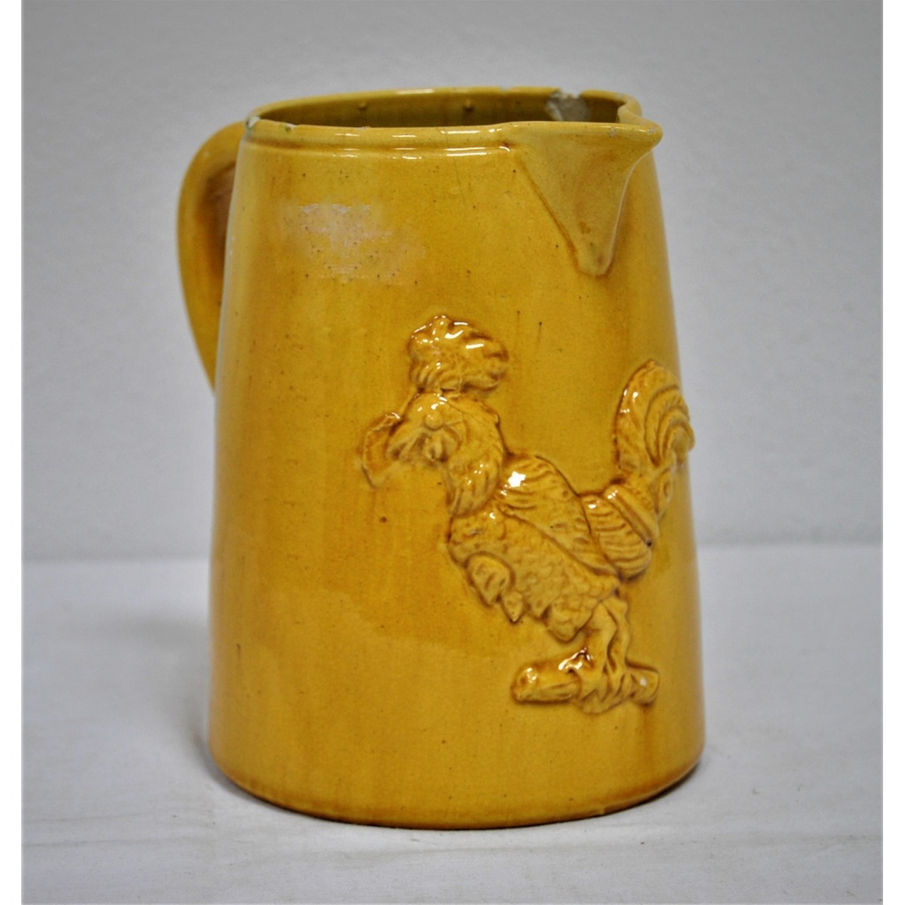 Jarro em cerâmica vidrada em tons de amarelo, decorado com figura relevada de um galo.