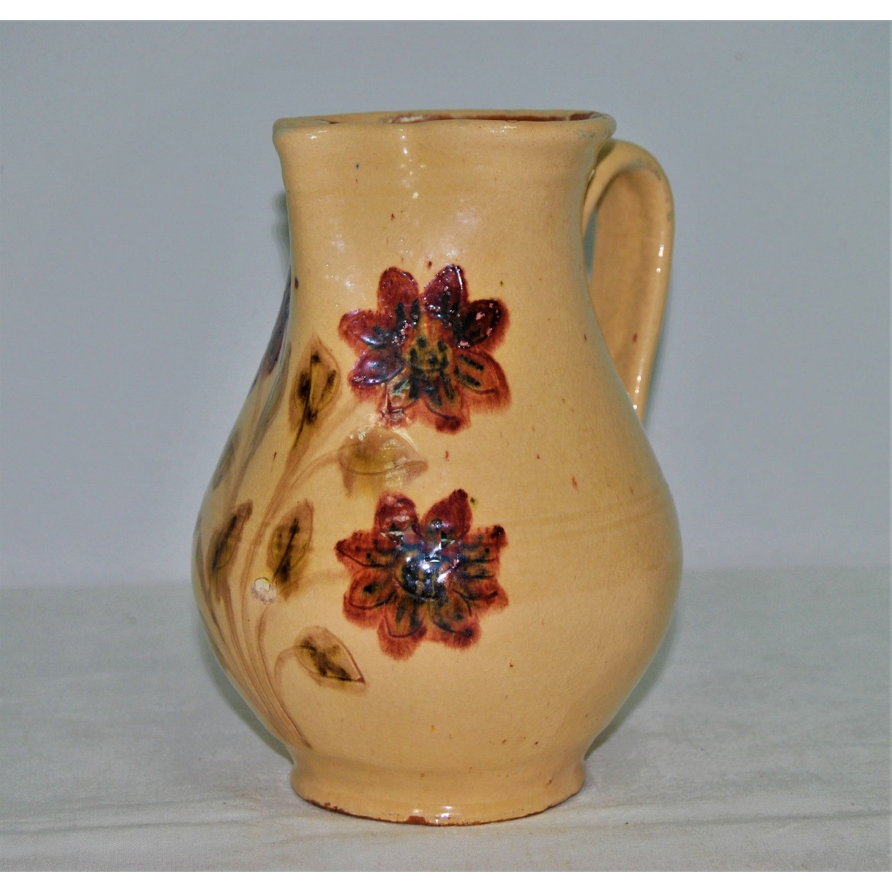 Jarro em barro vidrado e pintado em tons de beige, decorado com motivos florais pintados à mão em tons de castanho.