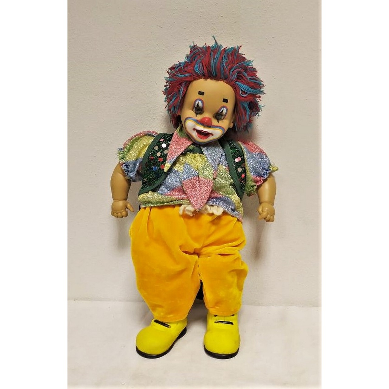 Palhaço vintage, brinquedo de criança composto por diversos materiais: cabeça e corpo em plástico e cabelo em lã. Roupas em tecido colorido. Século XX.
