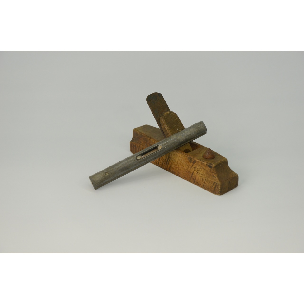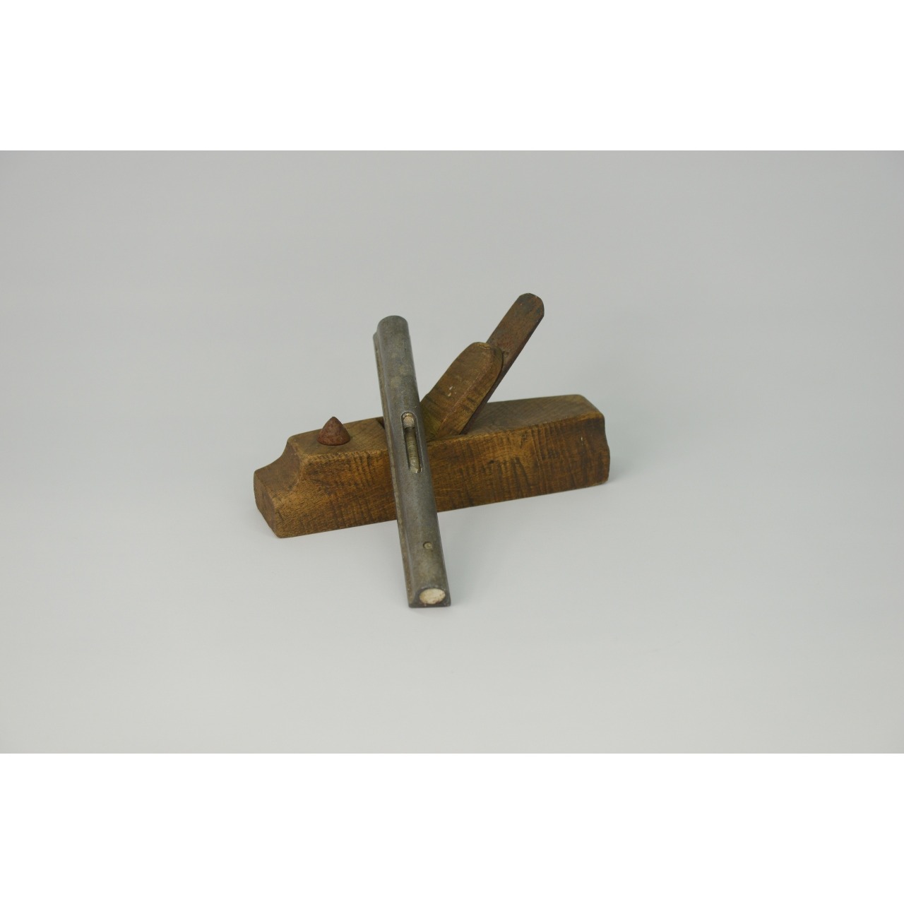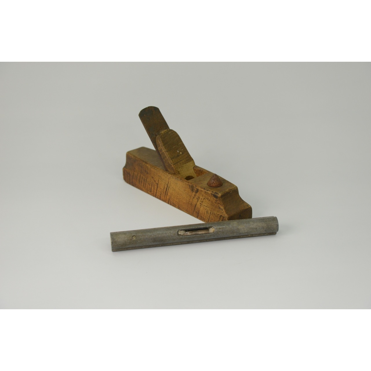 Conjunto de 2 ferramentas de Bricolage antigas composto por plaina de madeira e ferro, e um nível de alumínio com bolha no interior. decorada com friso recortado