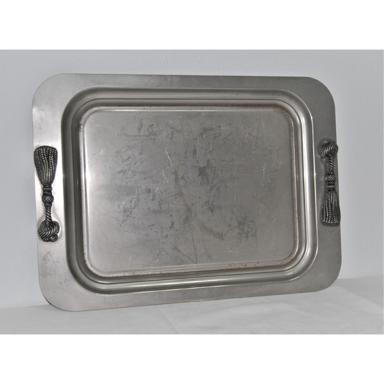 Tabuleiro em metal prateado, formato rectangular