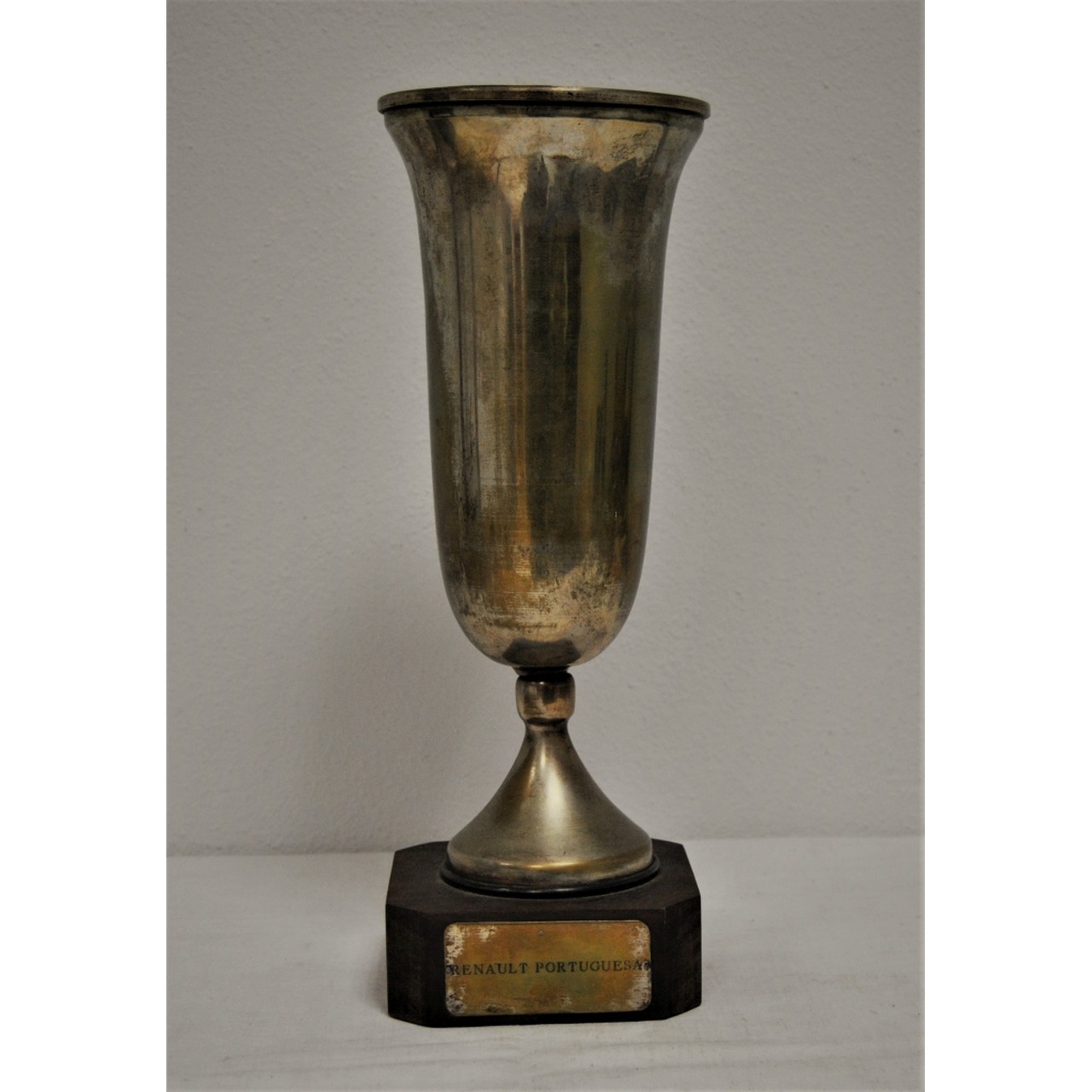 Taça comemorativa da "Renault Portuguesa" em metal prateado, assente em base quadrangular de madeira. Século XX.