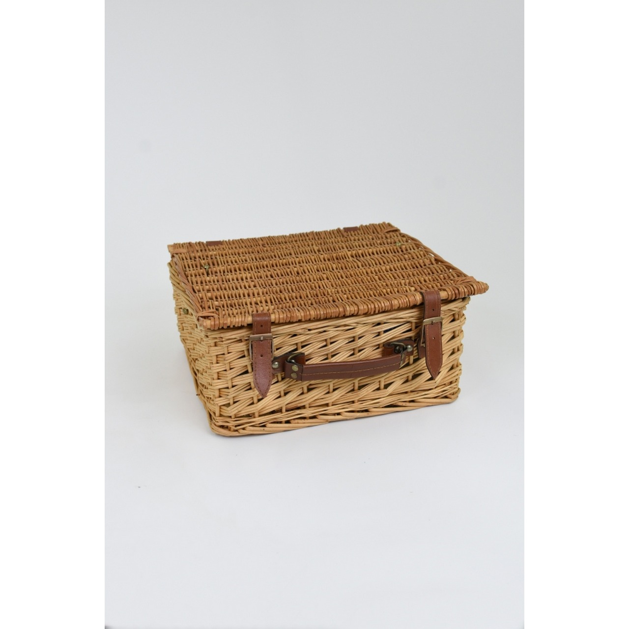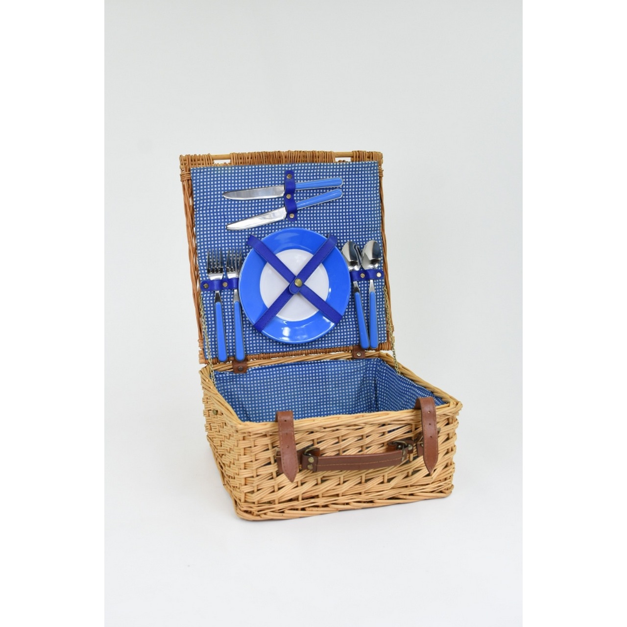 Cesto de Piquenique - Estrutura em vime forrado a tecido azul e branco, palamenta com dois pratos em baquelite, 2 facas, 2 garfos e 2 colheres. Pega e fechos em napa castanha