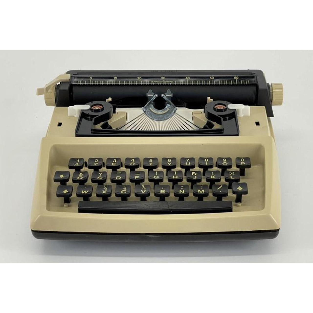 Máquina de escrever vintage, marca Byron Jardine, em plástico em tons de bege e castanho e tipo de teclado em estilo internacional.