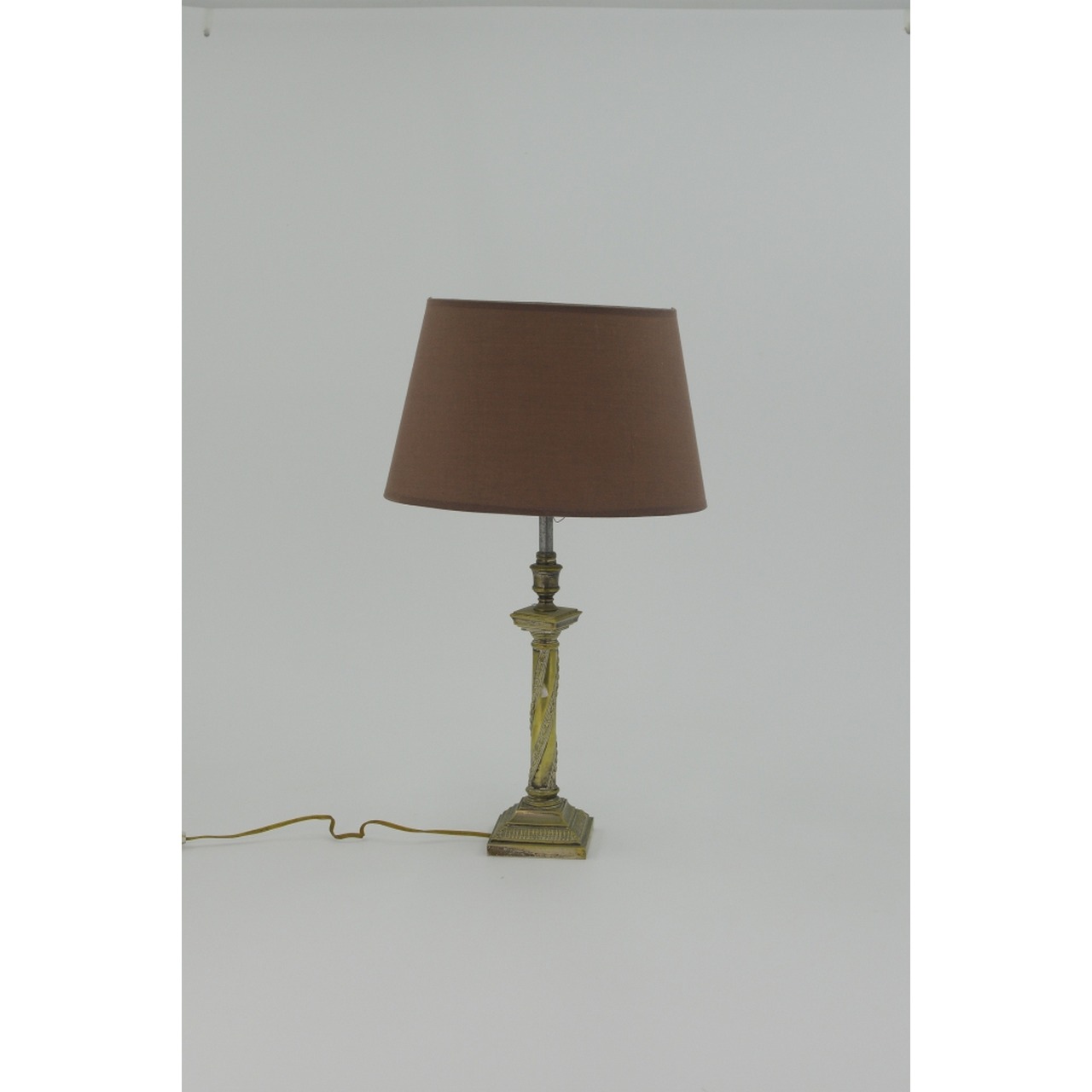 Candeeiro de mesa, estilo Neoclássico em metal prateado com fuste em formato de coluna. Com abat-jour incluído. Electrificado. Século XX