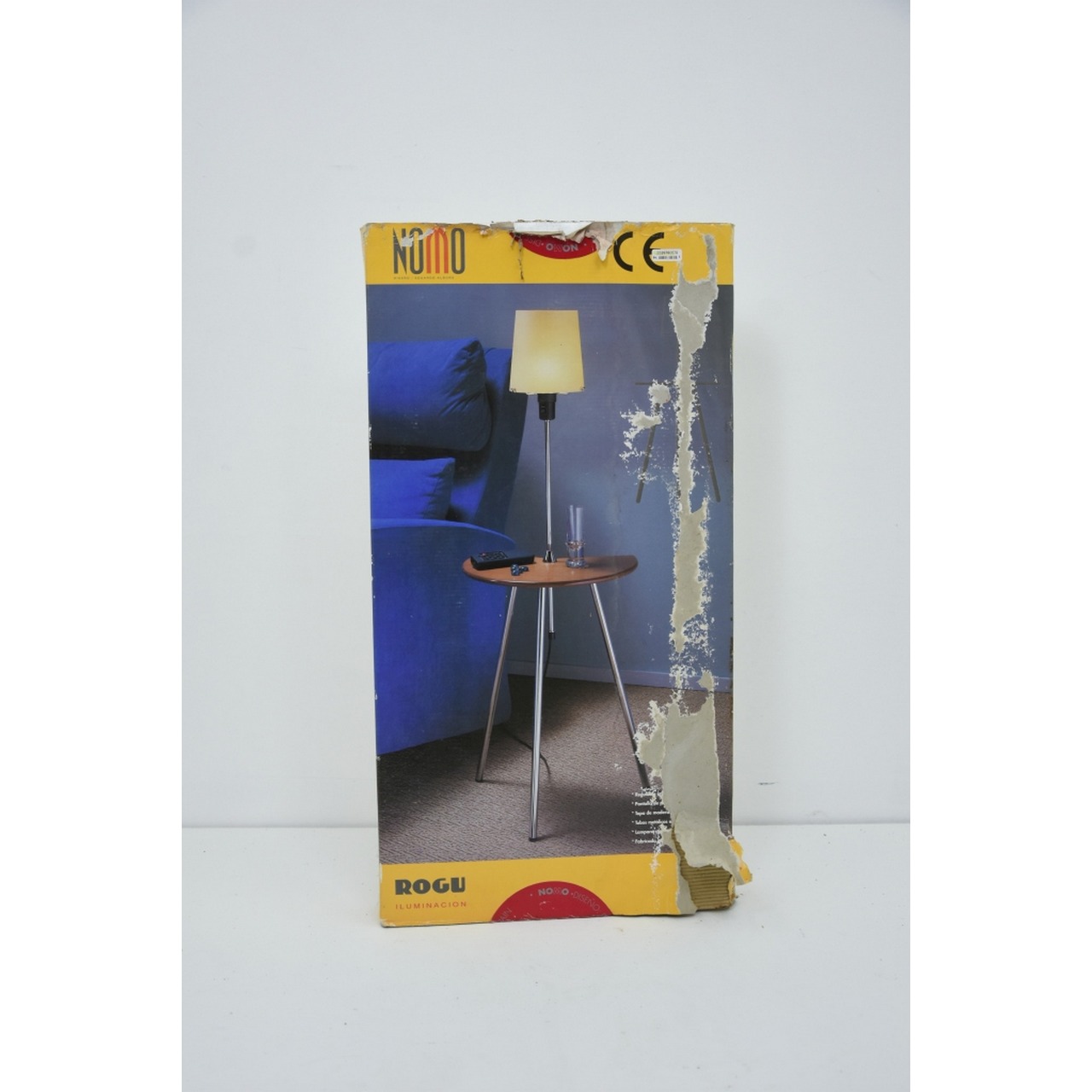 Candeeiro de pe em metal prateado com mesa de apoio em madeira
