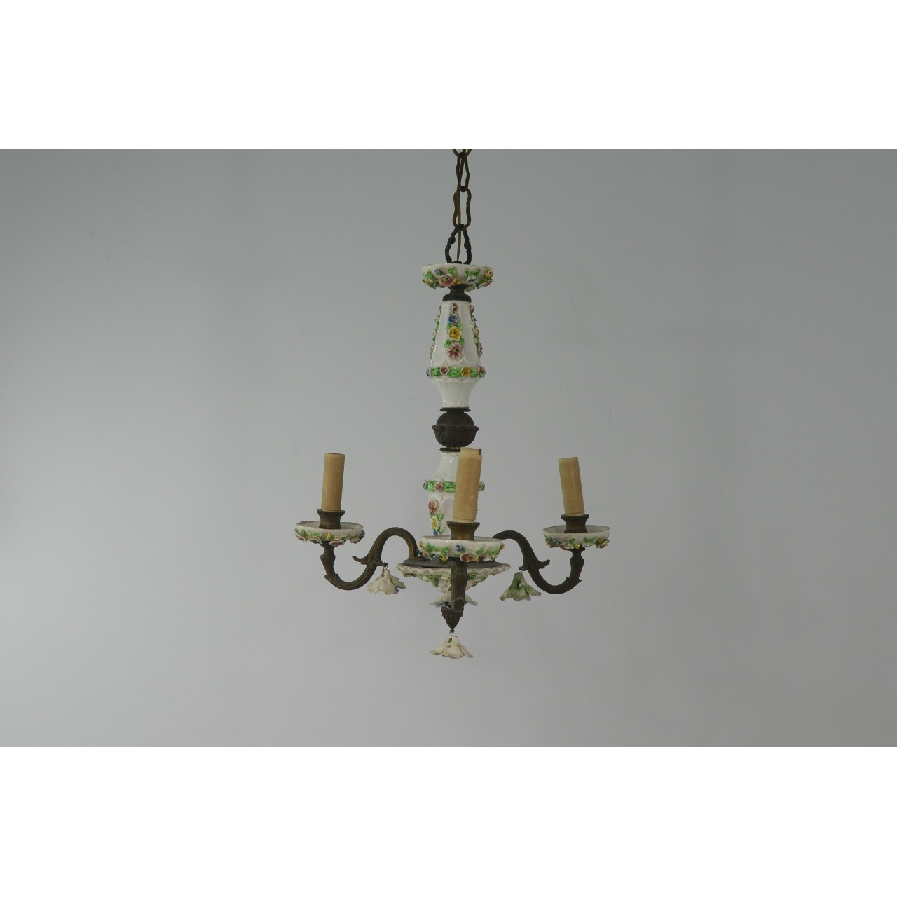 Candeeiro de teto de 3 lumes, em cêramica com motivos florais relevados