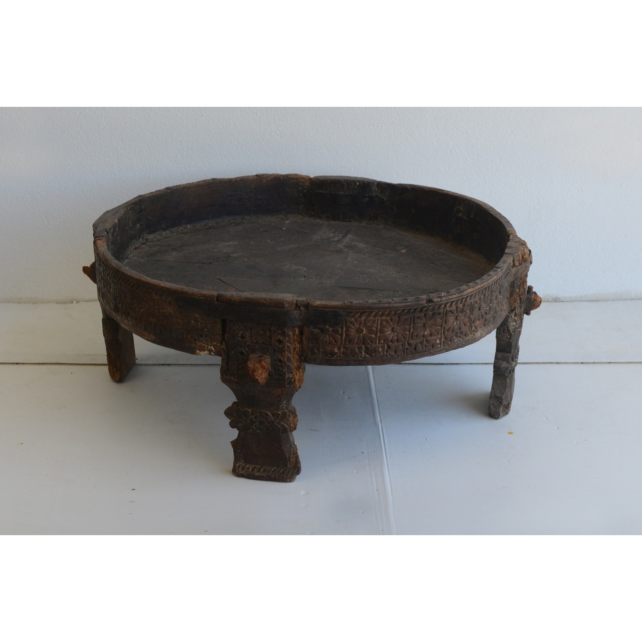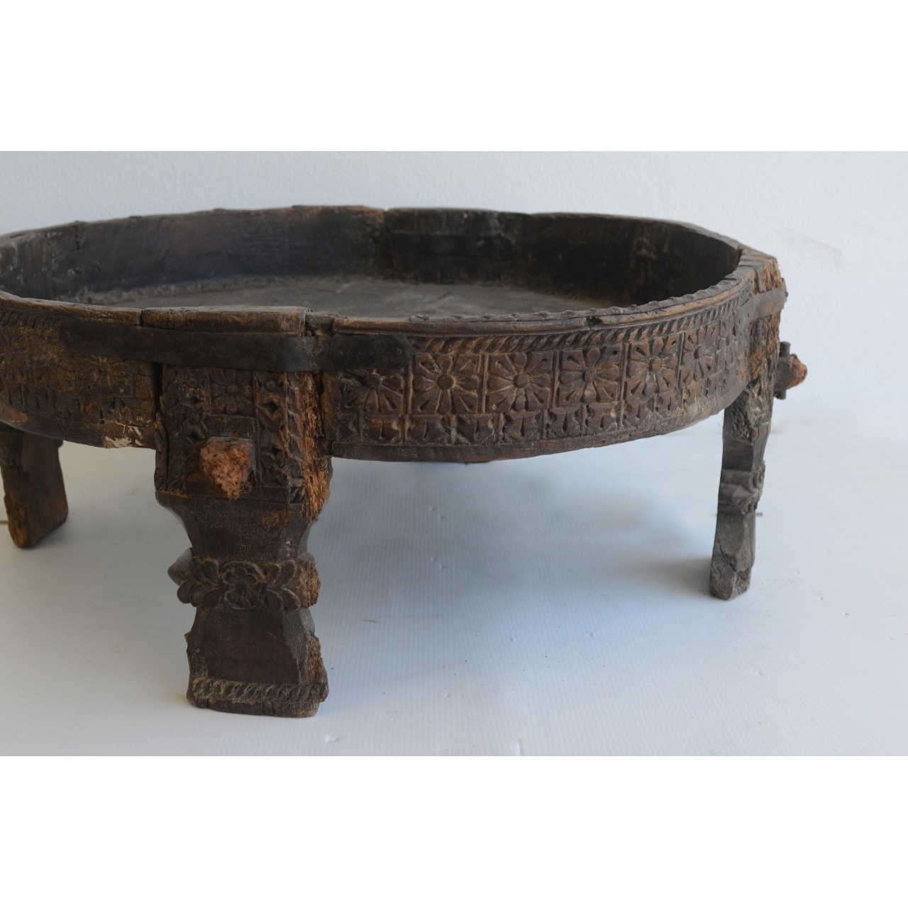 Mesa moedor em madeira entalhada, Chakki. Origem Indiana