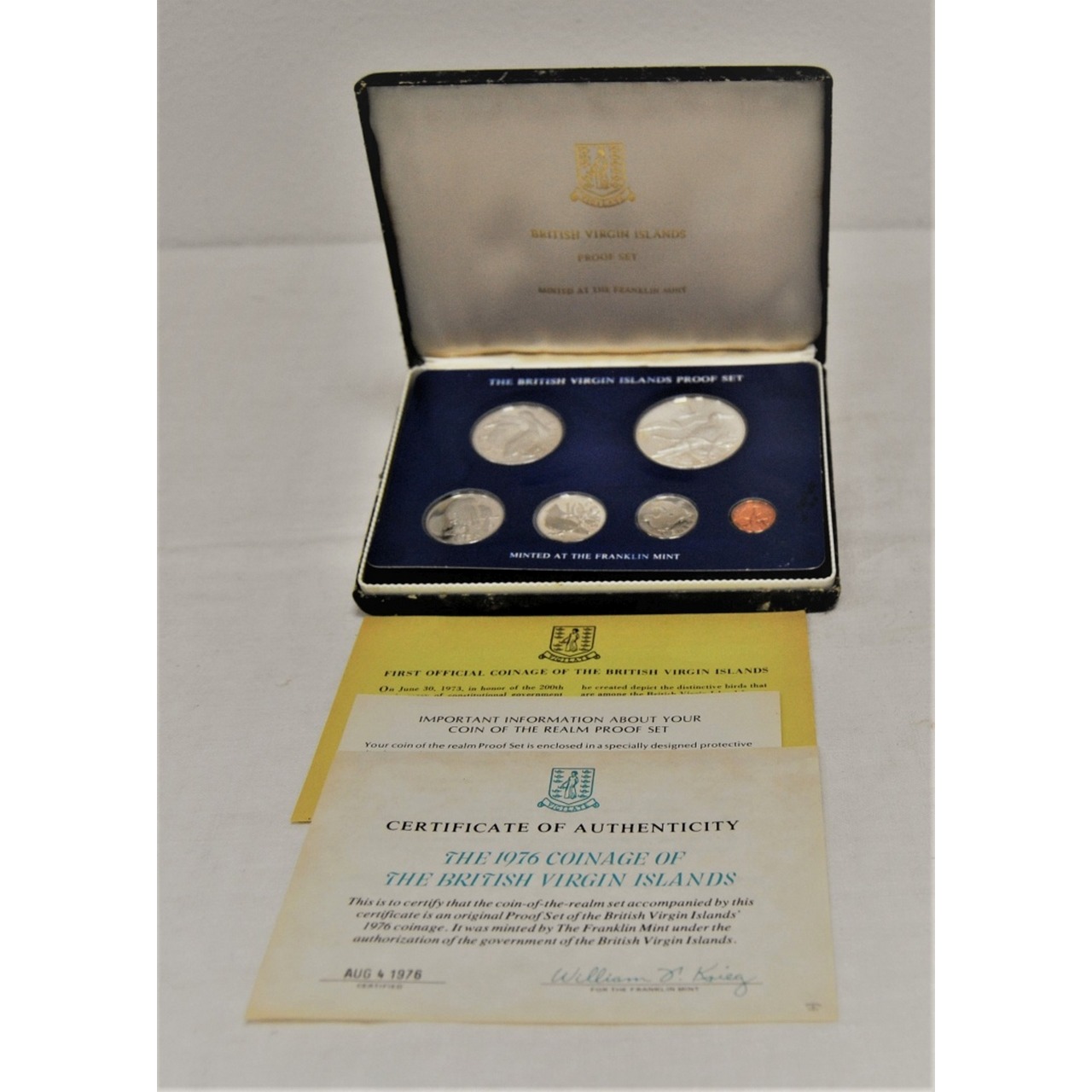 Coleção de moedas 'proof' das Ilhas inglesas Virgin, 1976 (The British Virgin Islands Proof Set, 1976). Conjunto de 6 moedas em prata e outros metais, conjunto 'proof'. Moedas seladas que não estiveram em circulação.