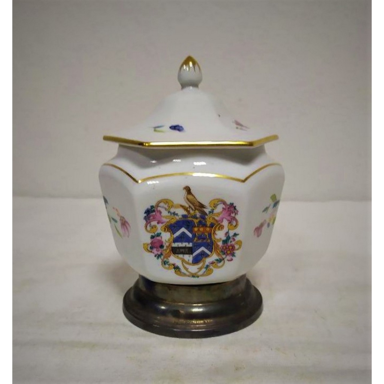 em porcelana portuguesa decorada com brasão e motivos florais. Com marca Porcel, Portugal. Assente em base encaixada de prata, com marca Topázio. Século XX.