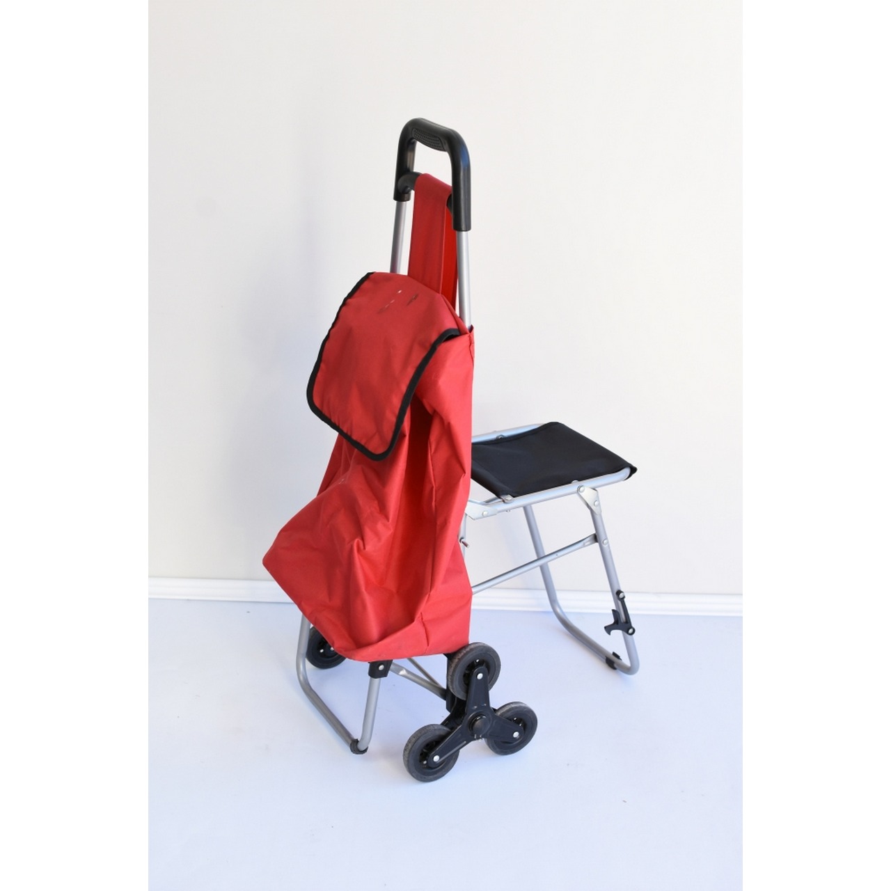 Carro de compras de 6 rodas para subir escadas. Com banco dobrável.