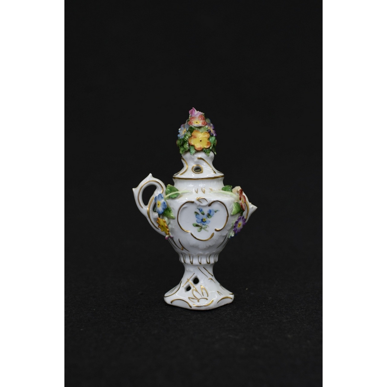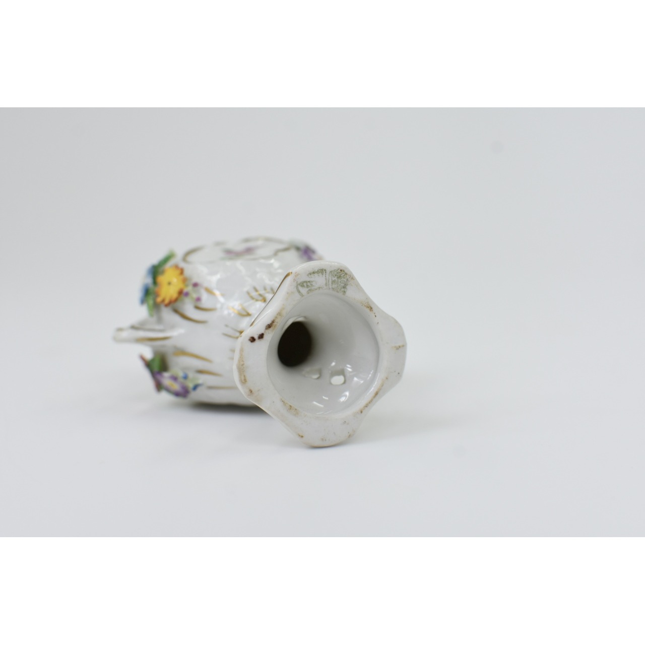 Defumador com 2 asas laterais (mas 1 asa está partida) igualmente decorado com flores relevadas. Com carimbo da Fábrica de porcelana alemã "Von Schierholz Porzellan Manufaktur Plaue" usada após 1930. Sinais de uso, pequenos defeitos e detalhes partidos.