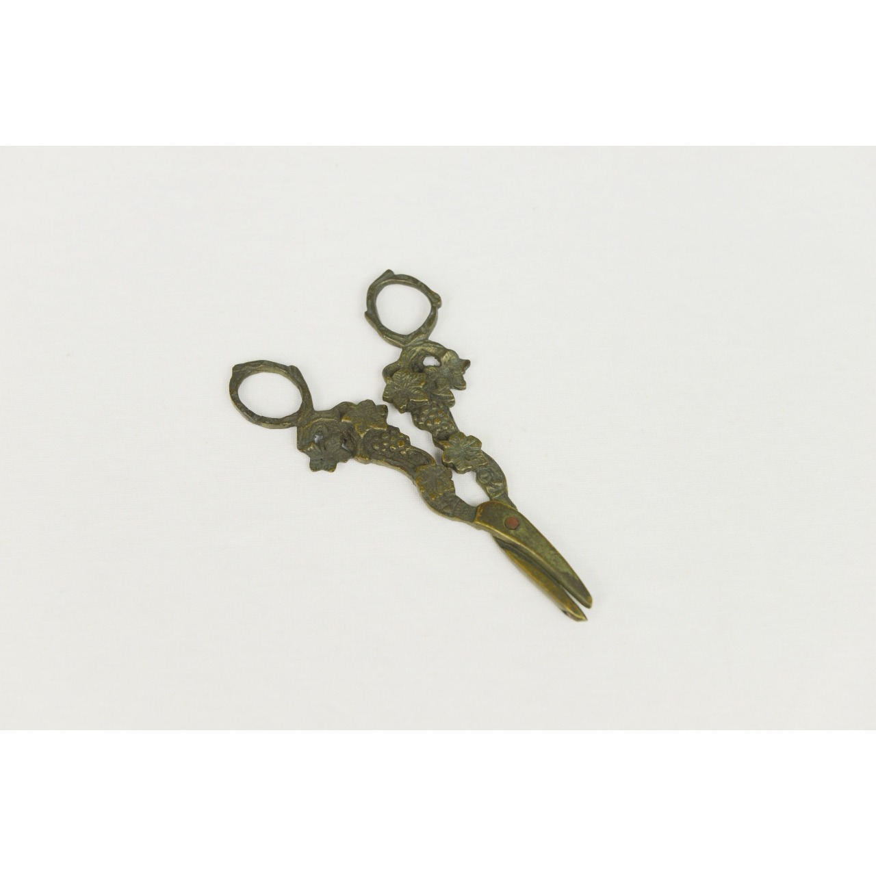 Tesoura de vindima em latão, decorada com parras de uva relevadas.