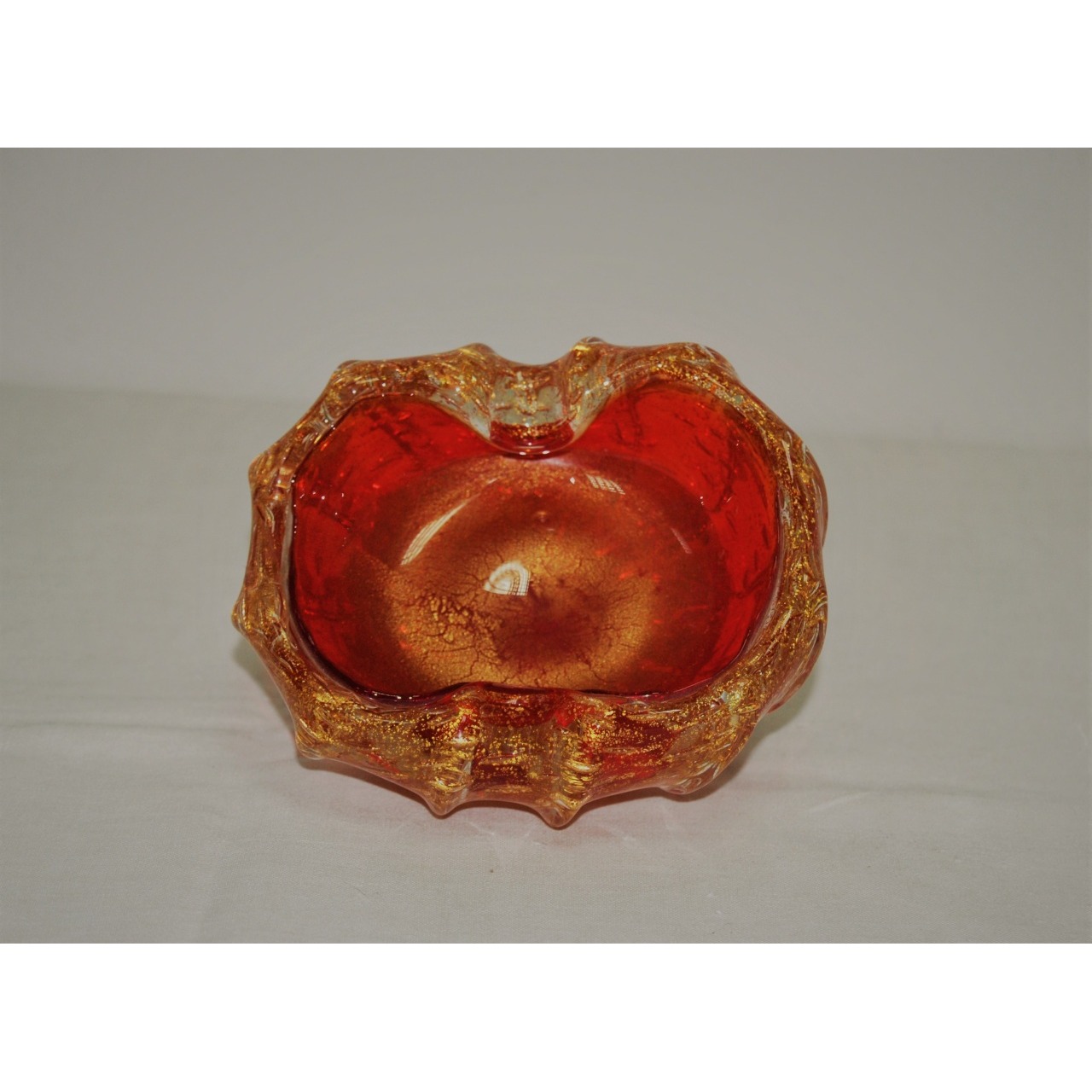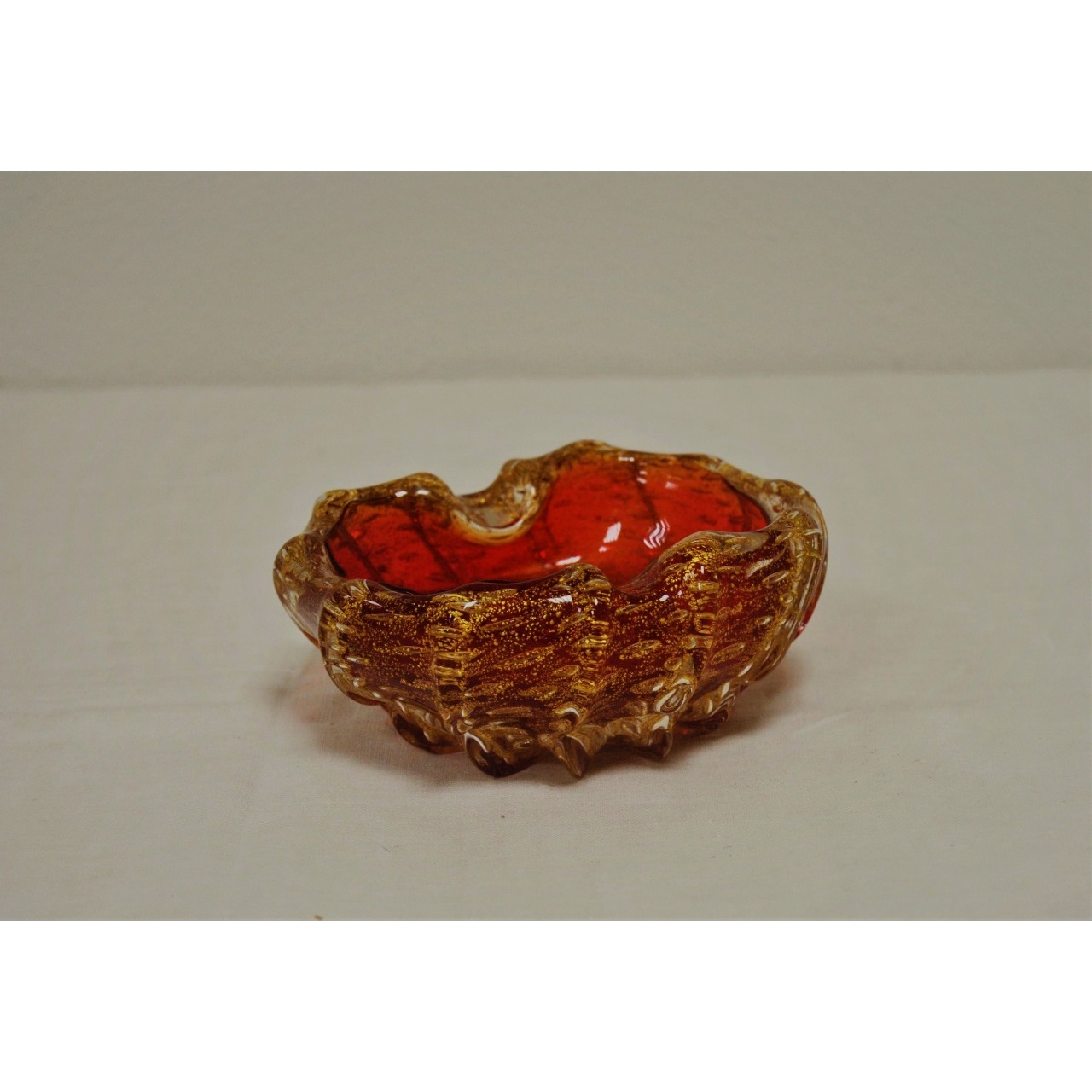Cinzeiro vintage em vidro soprado, em tons de vermelho com infusões a dourado. Possivelmente de vidro italiano Murano, idêntico aos modelos usados nos anos 50. Com etiqueta na base pouco visível.