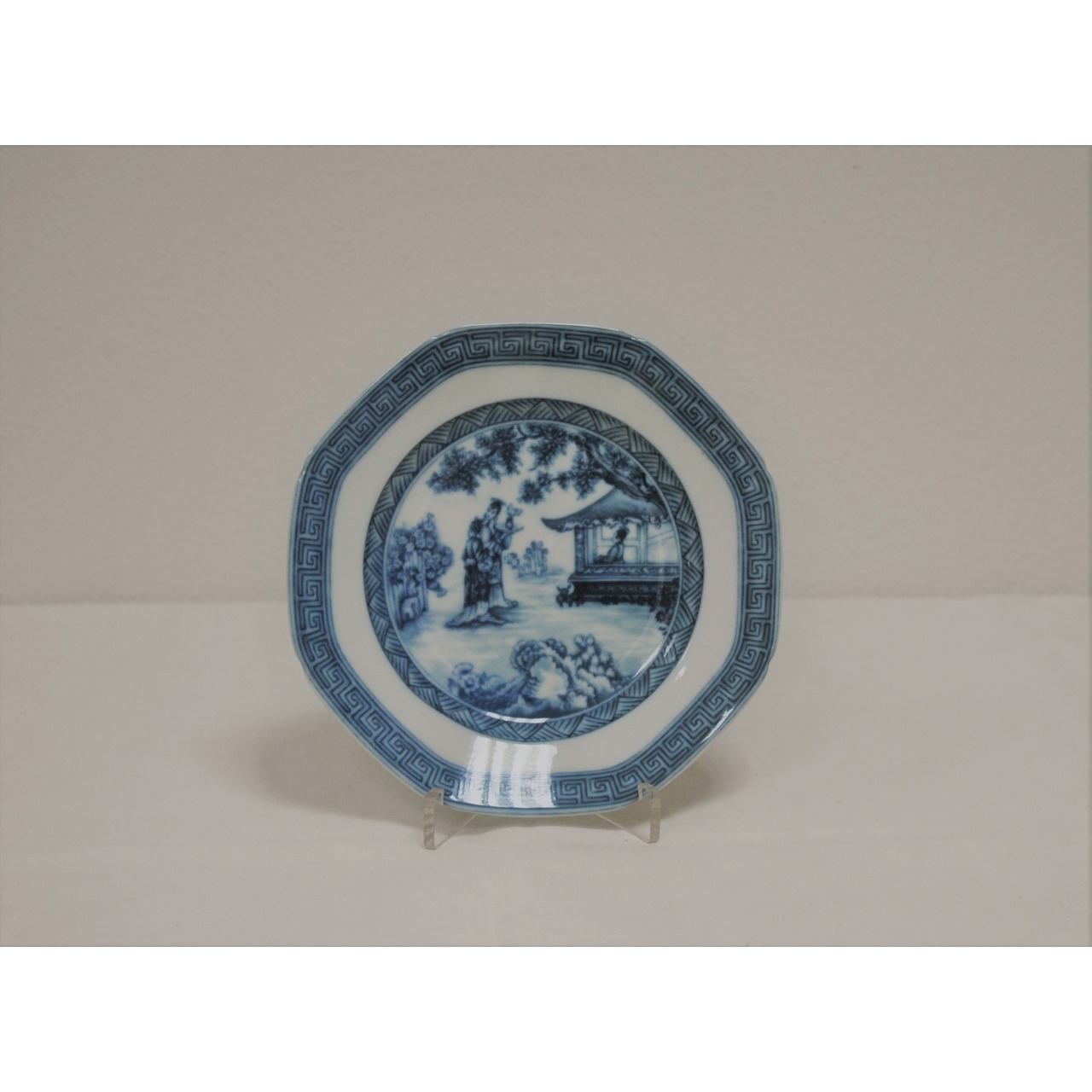 Covilhete oitavado em porcelana da Vista Alegre, decoração oriental em tons de azul e branco, encomenda para a Coleção Mottaheded Blue Canton, com marca na base n.º 36, usada entre 1980 - 1992
