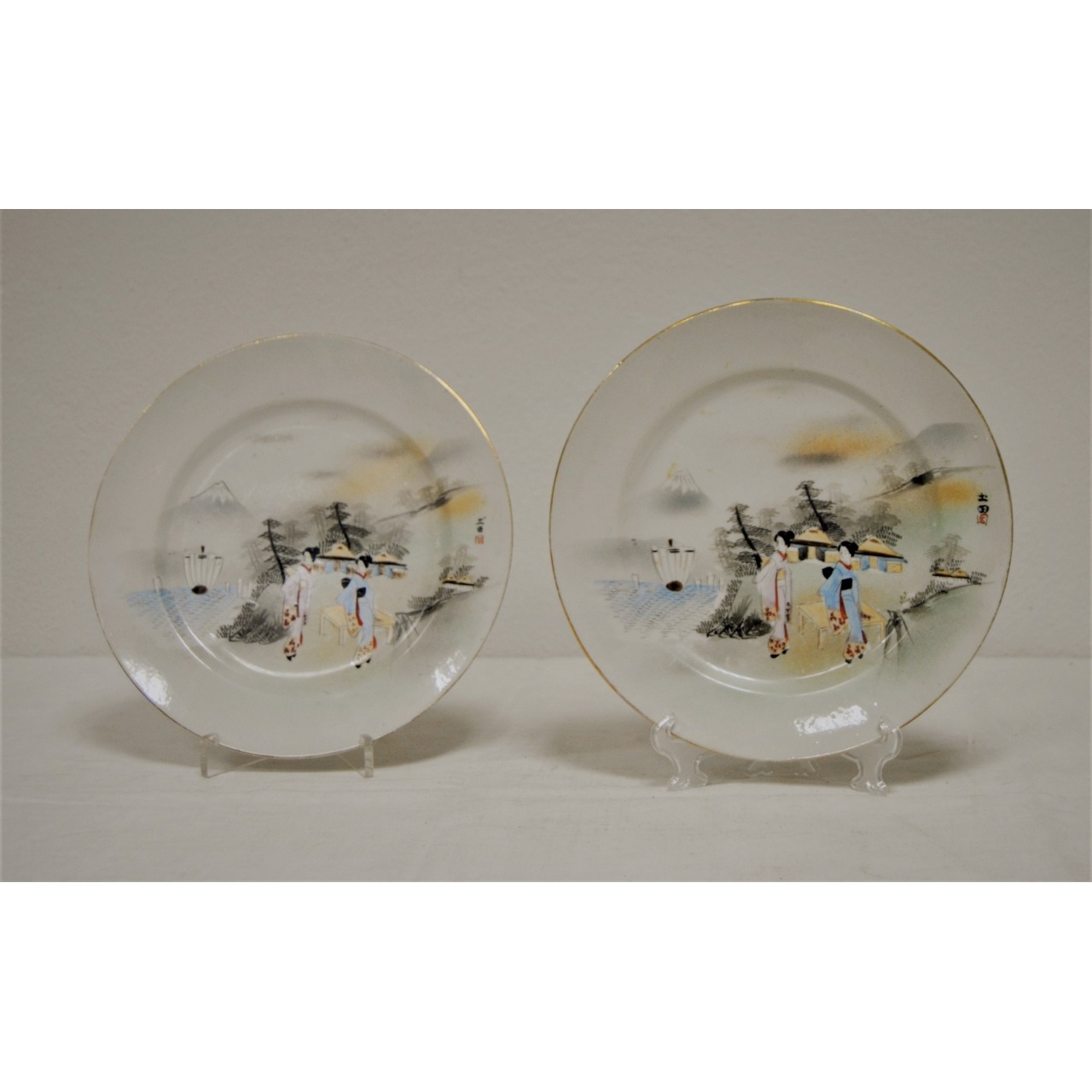 Par de pratos japoneses em porcelana, decorados com cena de paisagem com gueixas, pintados à mão em tons policromos.
