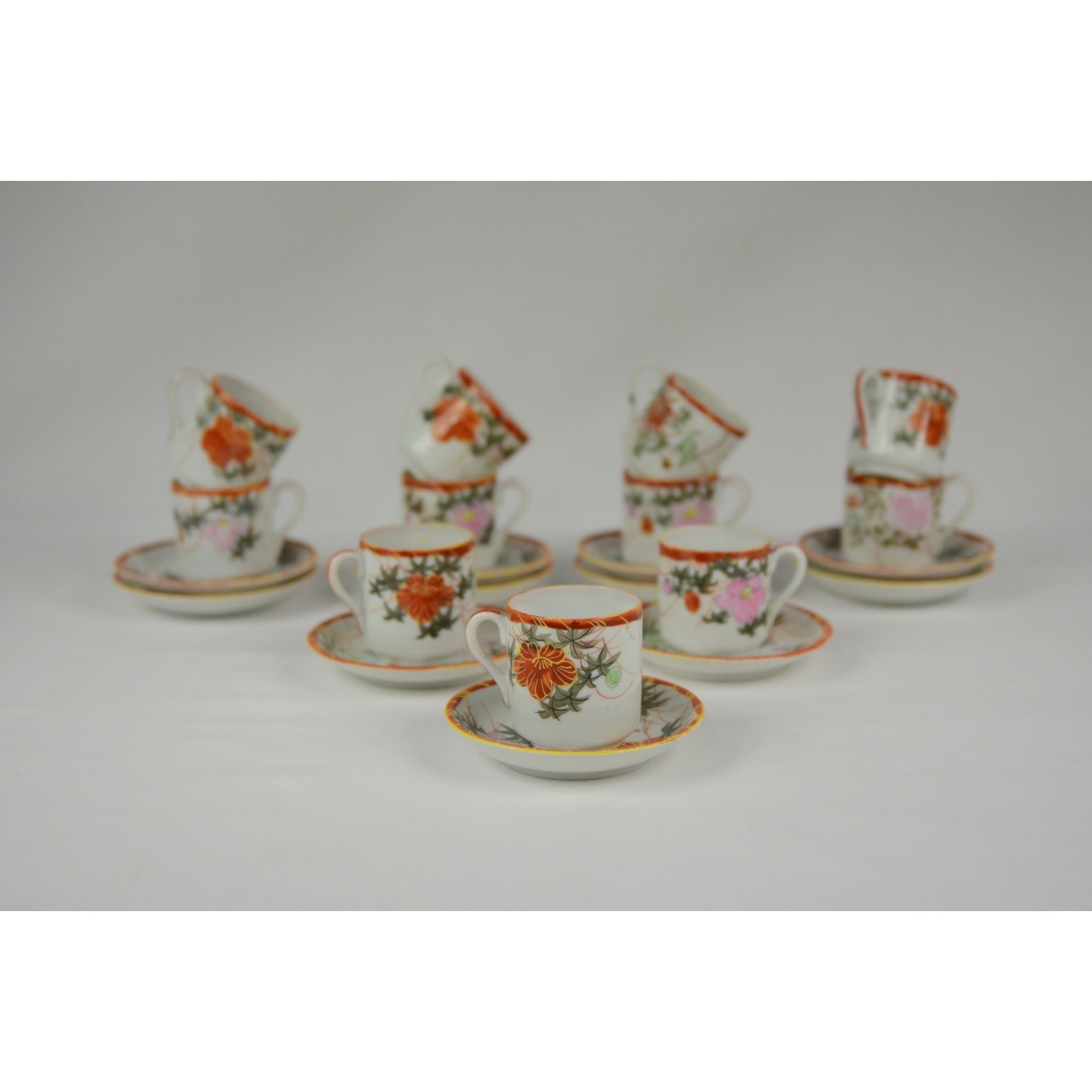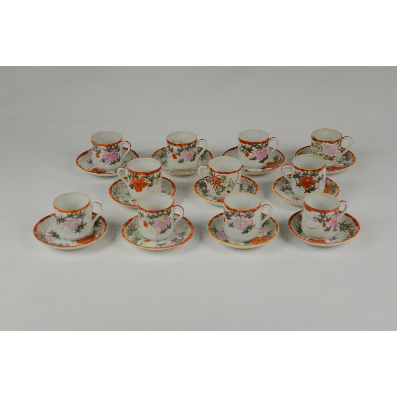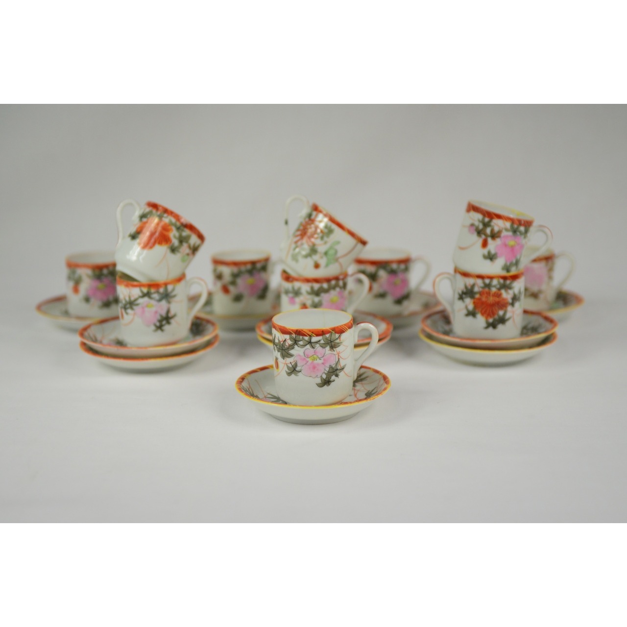 Parte de Serviço de Café, 22 peças, em porcelana oriental. Decorado com motivos florais em tons de laranja e rosa. Composto por 11 chávenas de café e respetivos 11 pires. Sem marca.