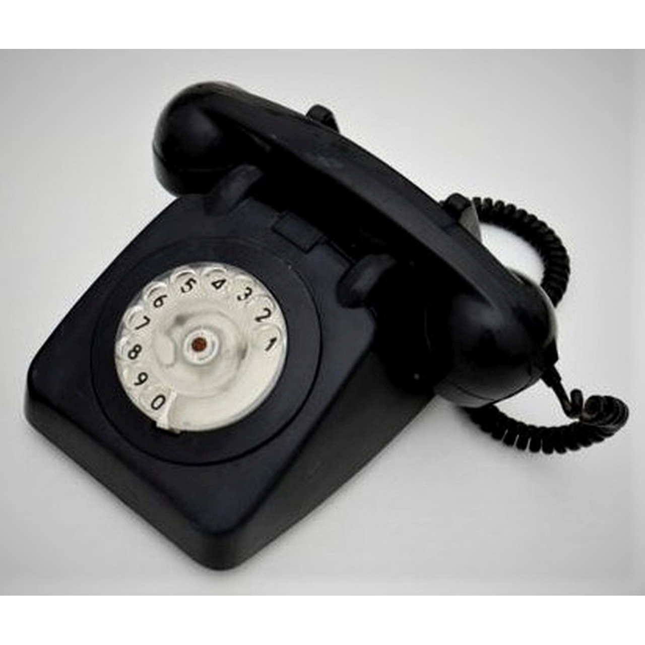 Telefone vintage em baquelite em tons de preto com marcação por disco.