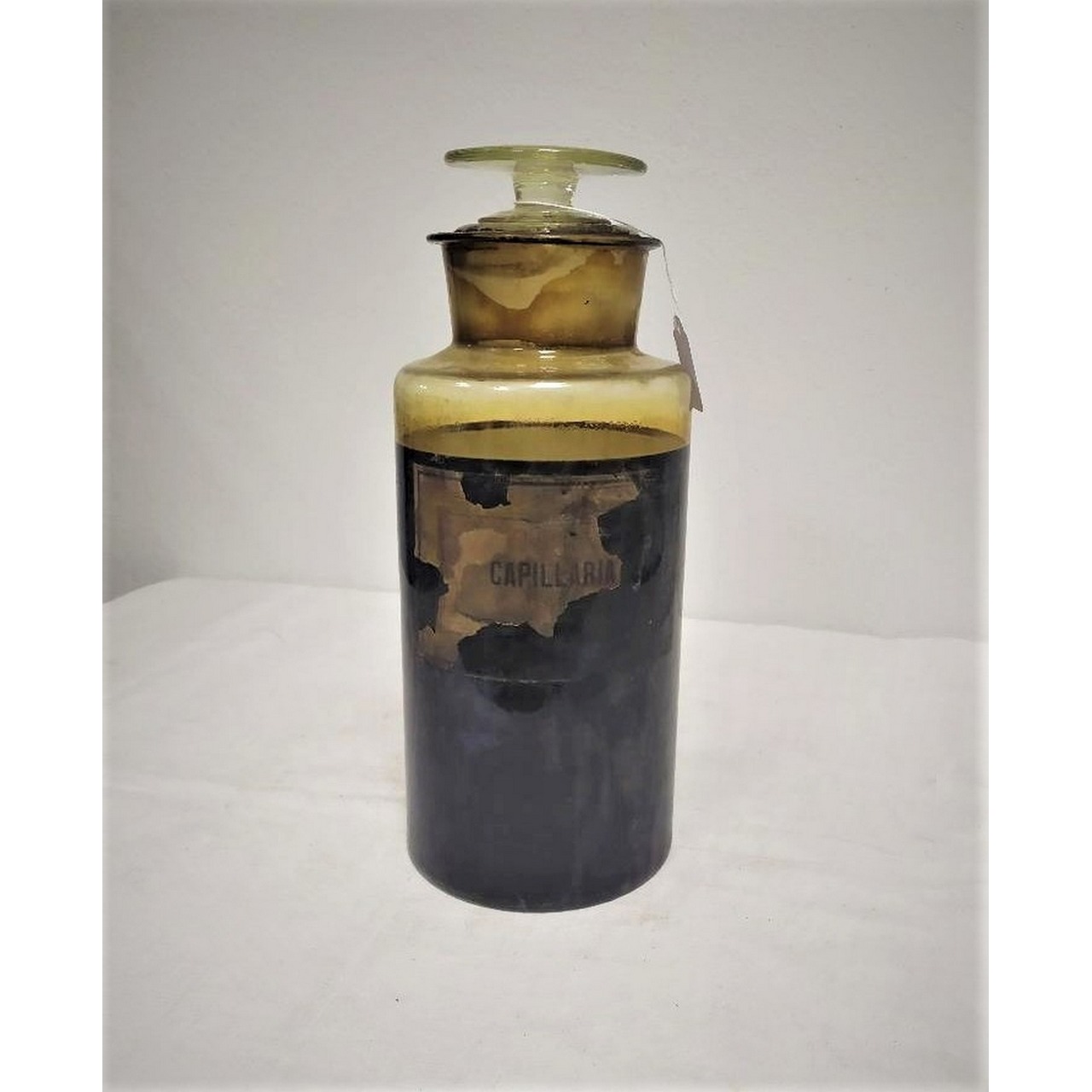 Frasco/pote de farmácia vintage em vidro moldado. Ainda contém produto da época no interior. Século XX.