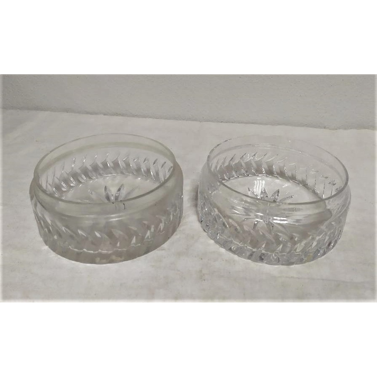 Par de taças circulares em cristal português, com lapidação bisotada estilizada, base estrelada. Marcado "Atlantis". Século XX.